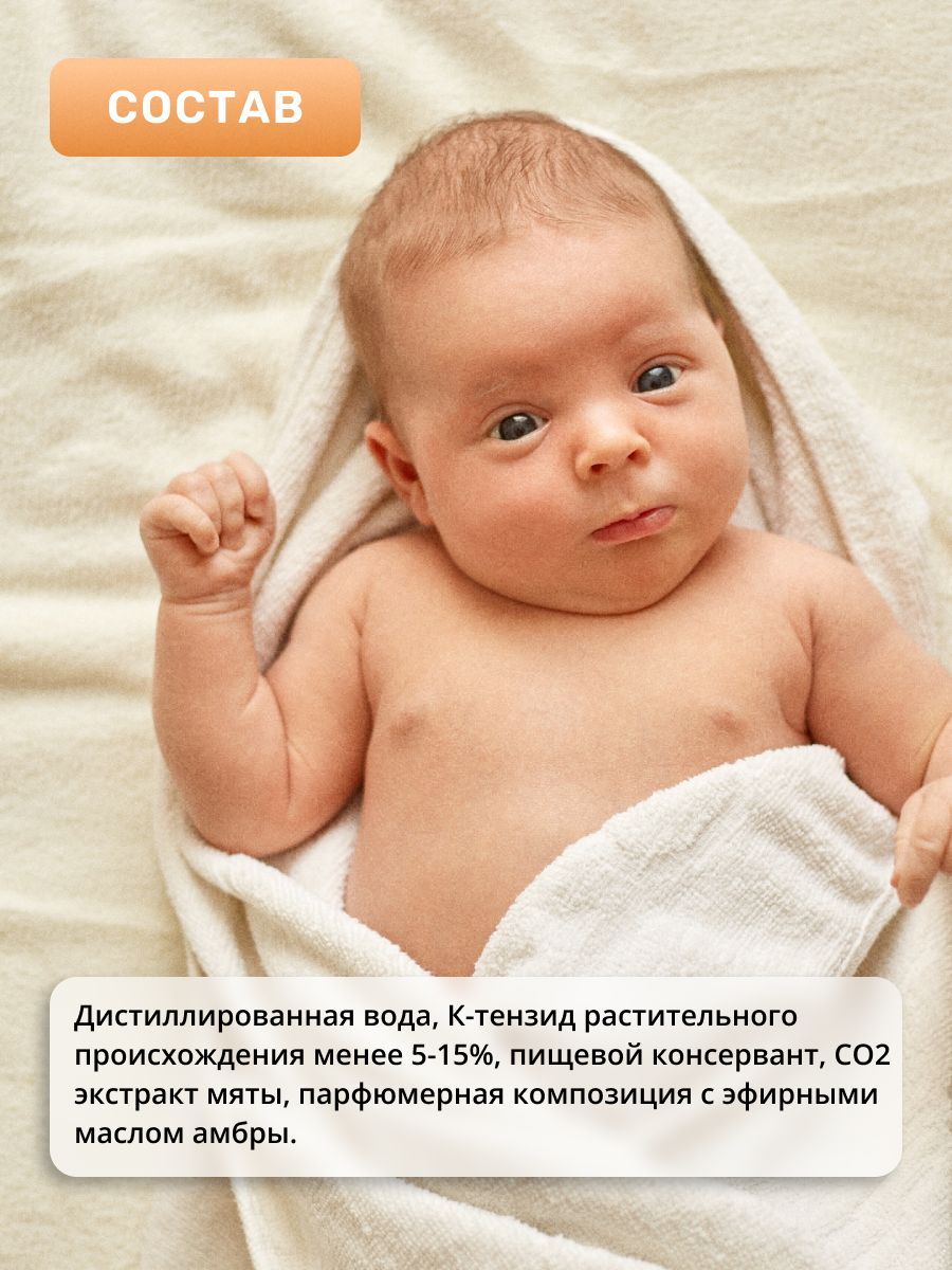 Дистиллированная вода, К-тензид растительного происхождения менее 5-15%, пищевой консервант, СО2 экстракт мяты, парфюмерная композиция с эфирными маслом амбры.