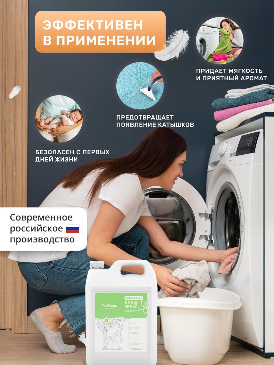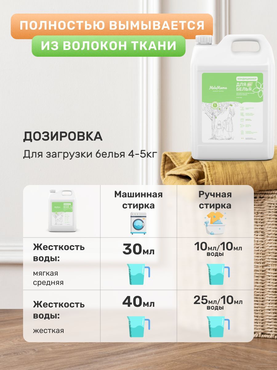 Описание: Кондиционер для белья гипоаллергенный MeloMama предназначен для ухода за всеми видами тканей, придавая мягкость и нежный аромат вещам после стирки. Применим для всех типов стиральных машин и ручной стирки.