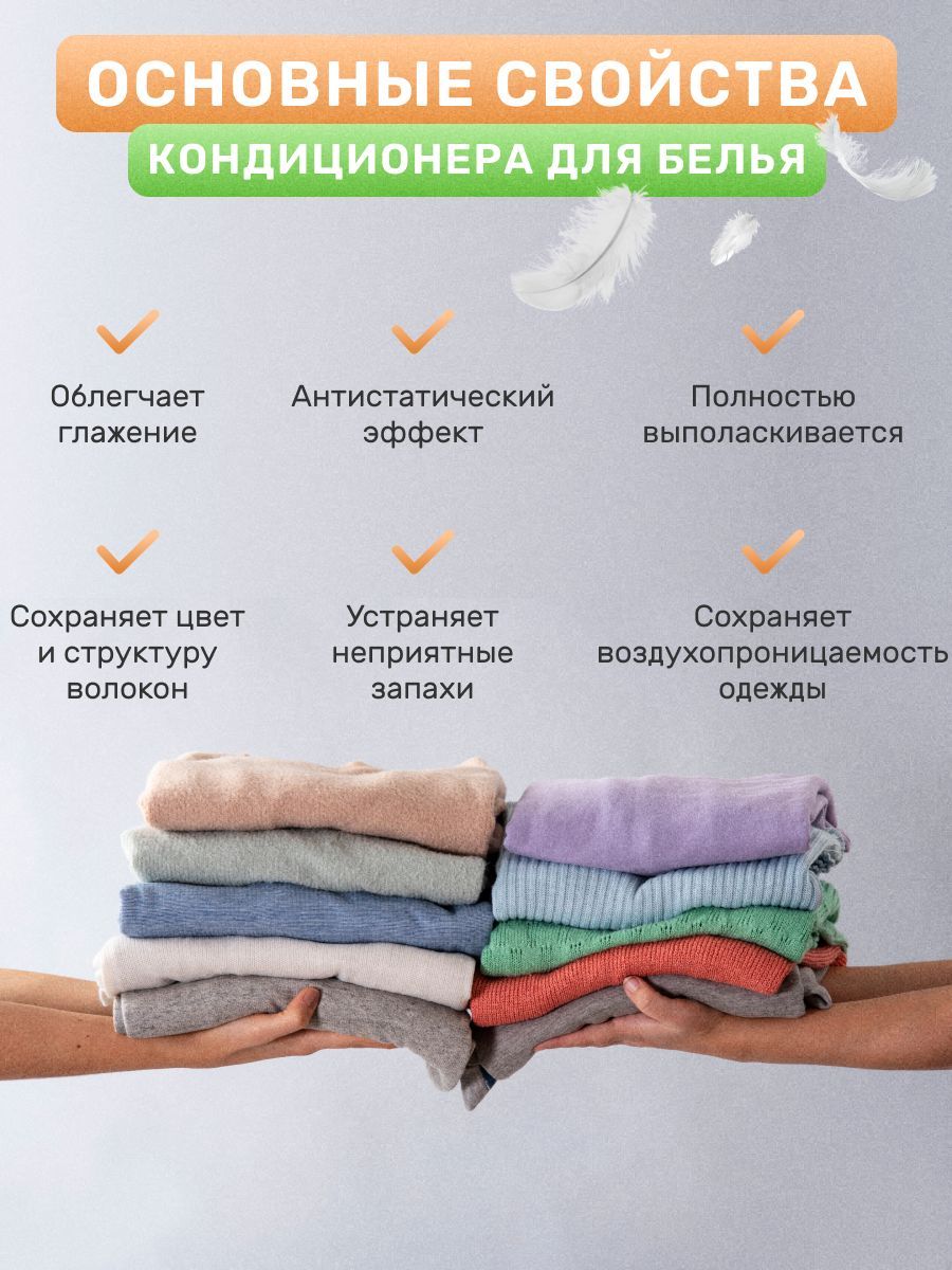 Особенности применения: Антистатический эффект, Ароматизация, Гипоаллергенность, Концентрат, Экосредство, Эффективен в холодной воде
