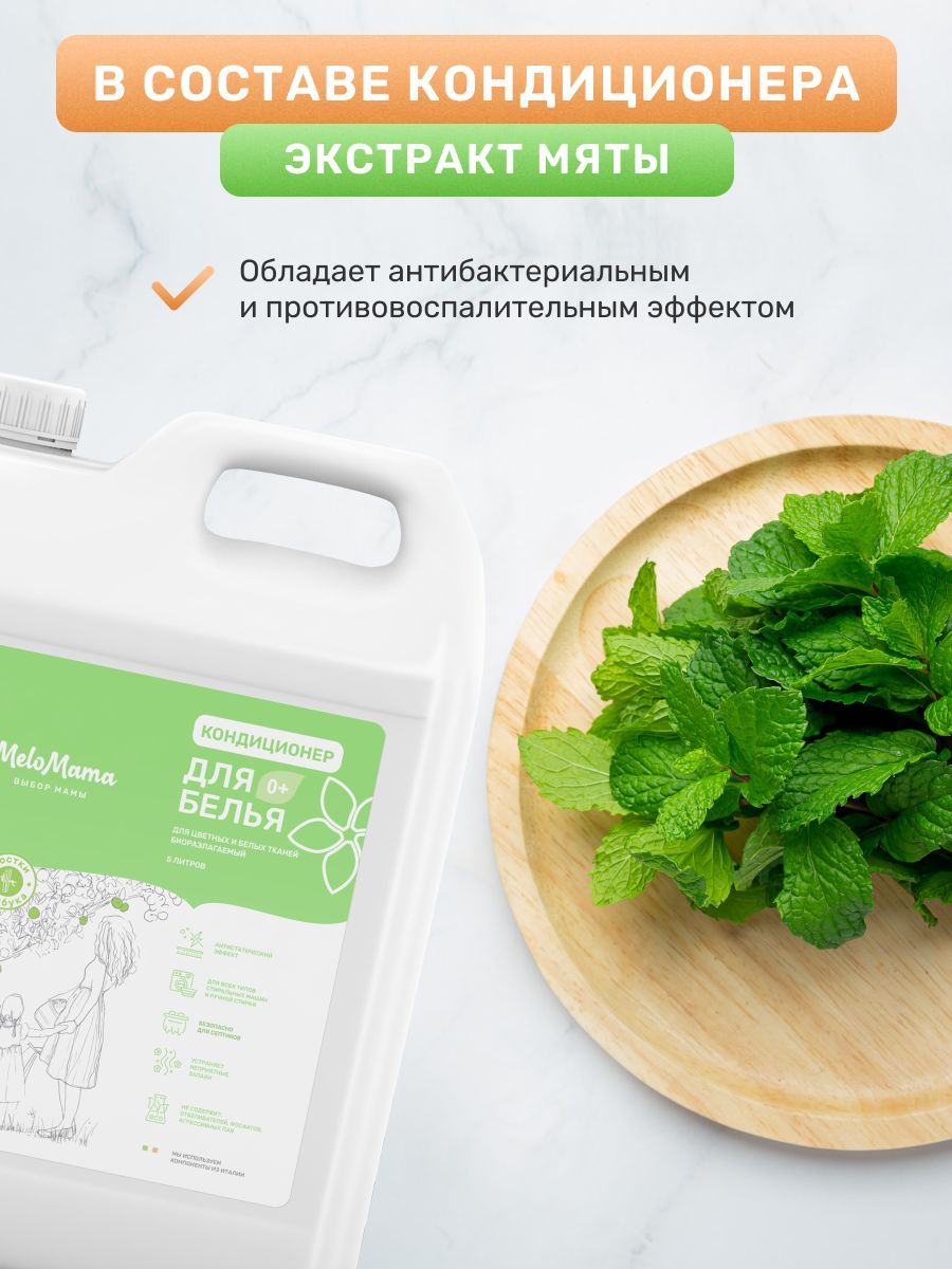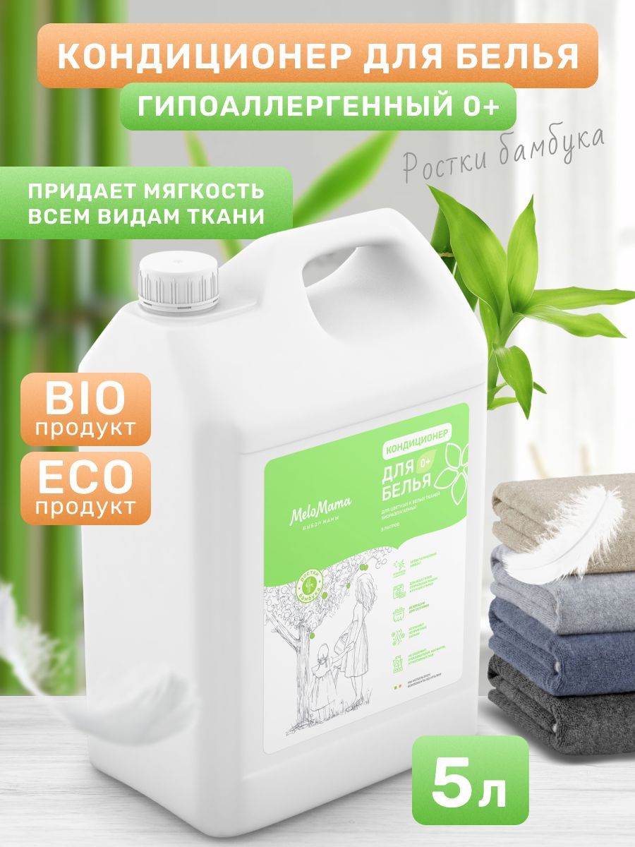 Эко кондиционер-ополаскиватель для стирки белья 5 литров MeloMama Ростки бамбука, гипоаллергенный, подходит для детской одежды 0+, канистра 5л