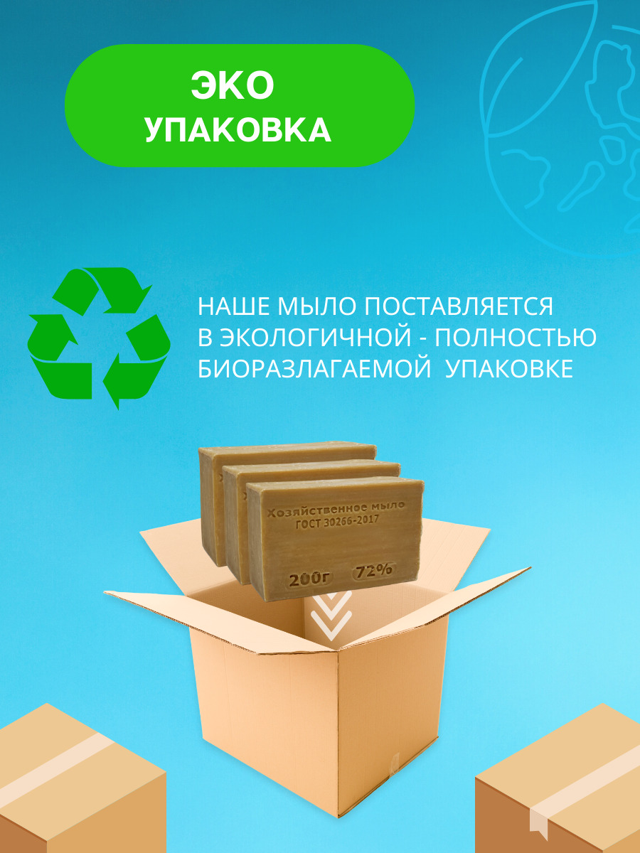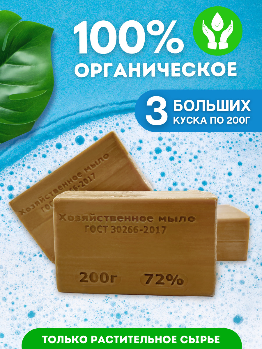 ЭКО мыло хозяйственное 72% гипоаллергенное ГОСТ (3шт по 200гр.) из натуральных компонентов Eco Will твердое кусковое. Универсальное. Для стирки и мытья рук. Биоразлагаемое.