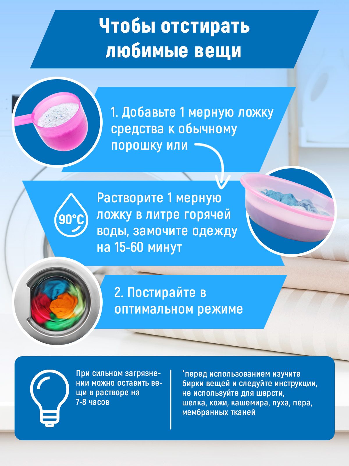 Средство подходит для стирки белой, цветной и черной одежды. Сохраняет яркость и насыщенность цветного и черного белья. Возвращает и сохраняет белизну белого белья , препятствуя появлению серого оттенка. Кислородный отбеливатель-пятновыводитель справляется даже с трудновыводимыми пятнами: кофе, ягоды, вино, соусы, масло, шоколад, напитки, трава, пятна от пота. Средство для стирки белья отлично подойдёт как усилитель эффективности обычного порошка.
