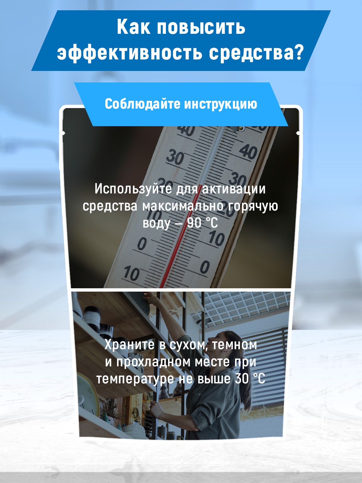 Перкарбонат натрия 100% в составе порошка достигает максимального эффекта и активируется в горячей воде 90 градусов, начинается реакция выделения активного кислорода, которая способствует расщеплению загрязнений.