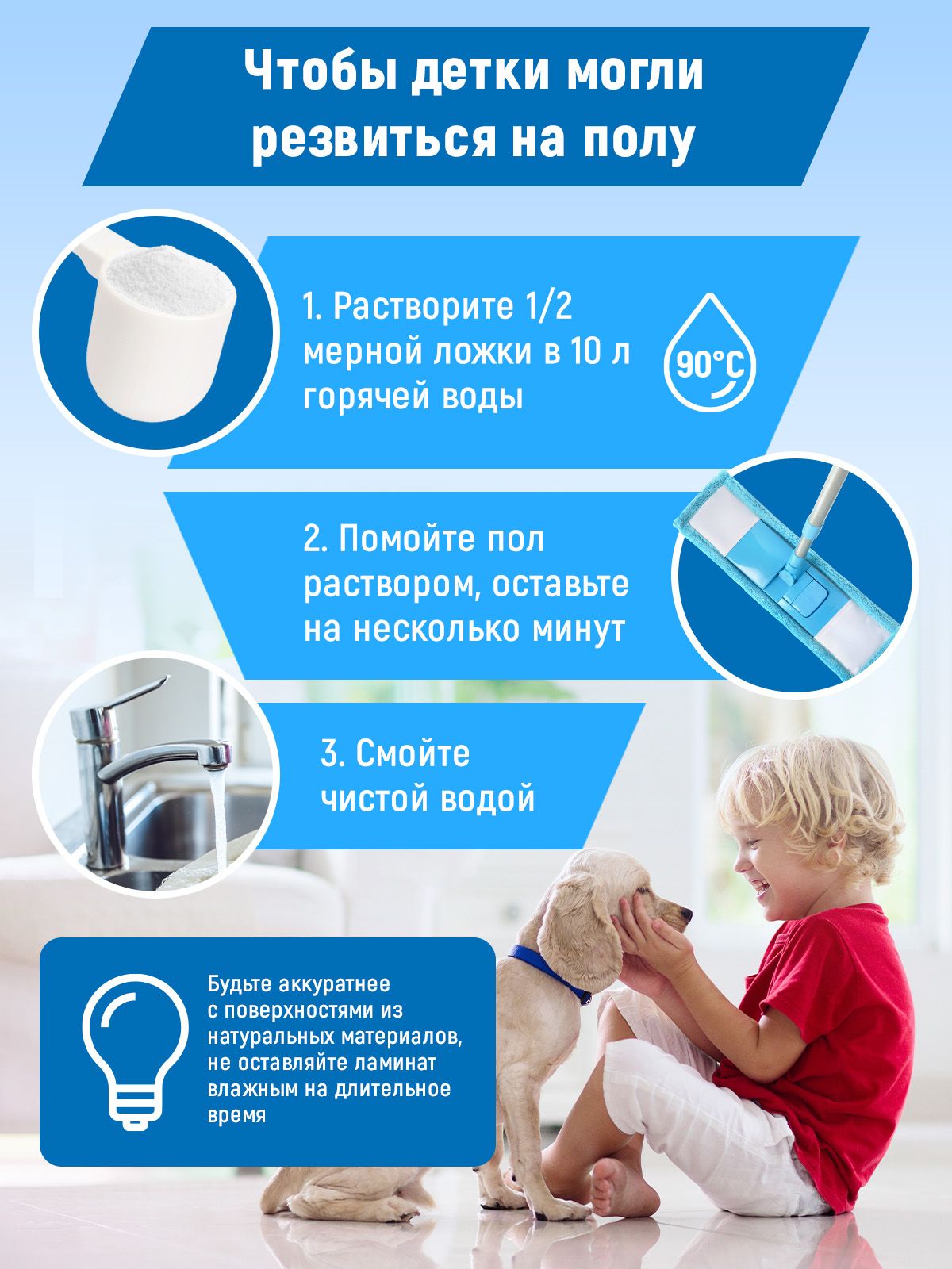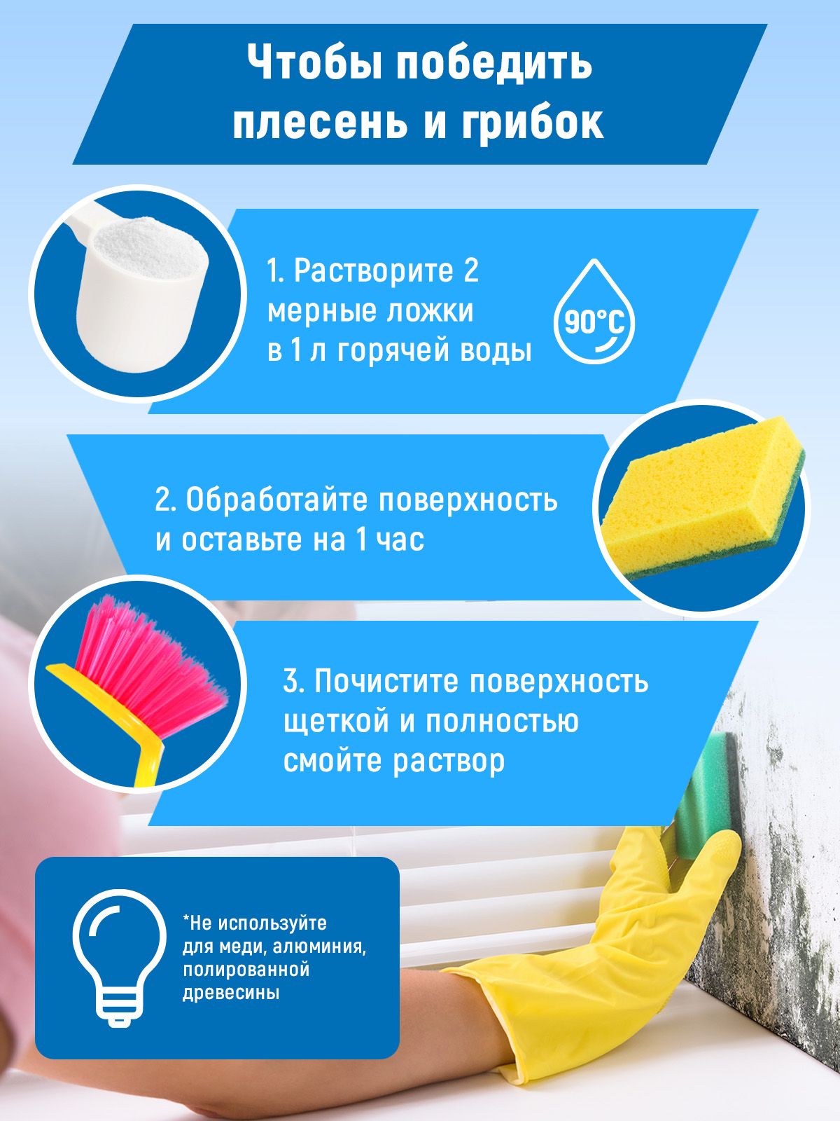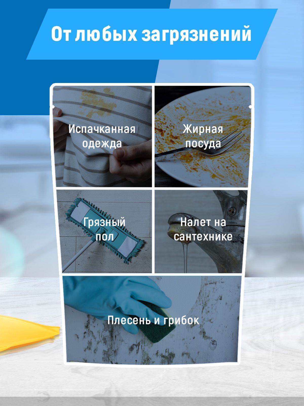 Кислородный очиститель справляется с загрязнениями любой сложности на любых поверхностях и имеет более 100 способов применения - всё благодаря активному кислороду, который глубоко проникает в загрязнения и расщепляет их изнутри.