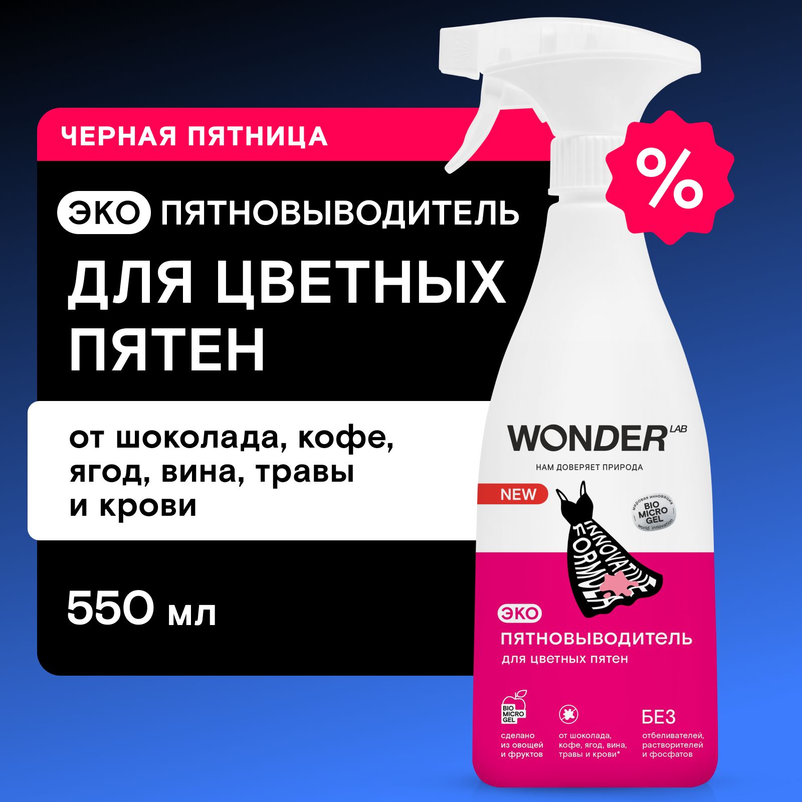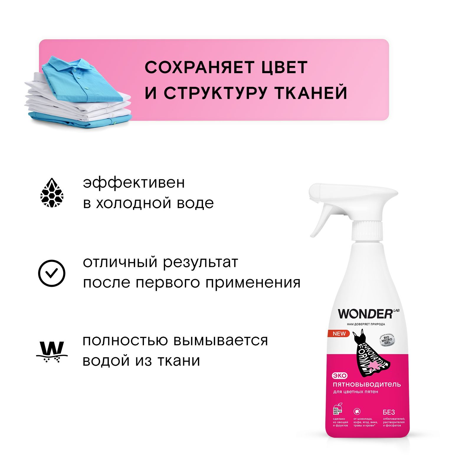 Описание: Пятновыводитель WONDER LAB удаляет свежие и въевшиеся цветные пятна с любых типов ткани.