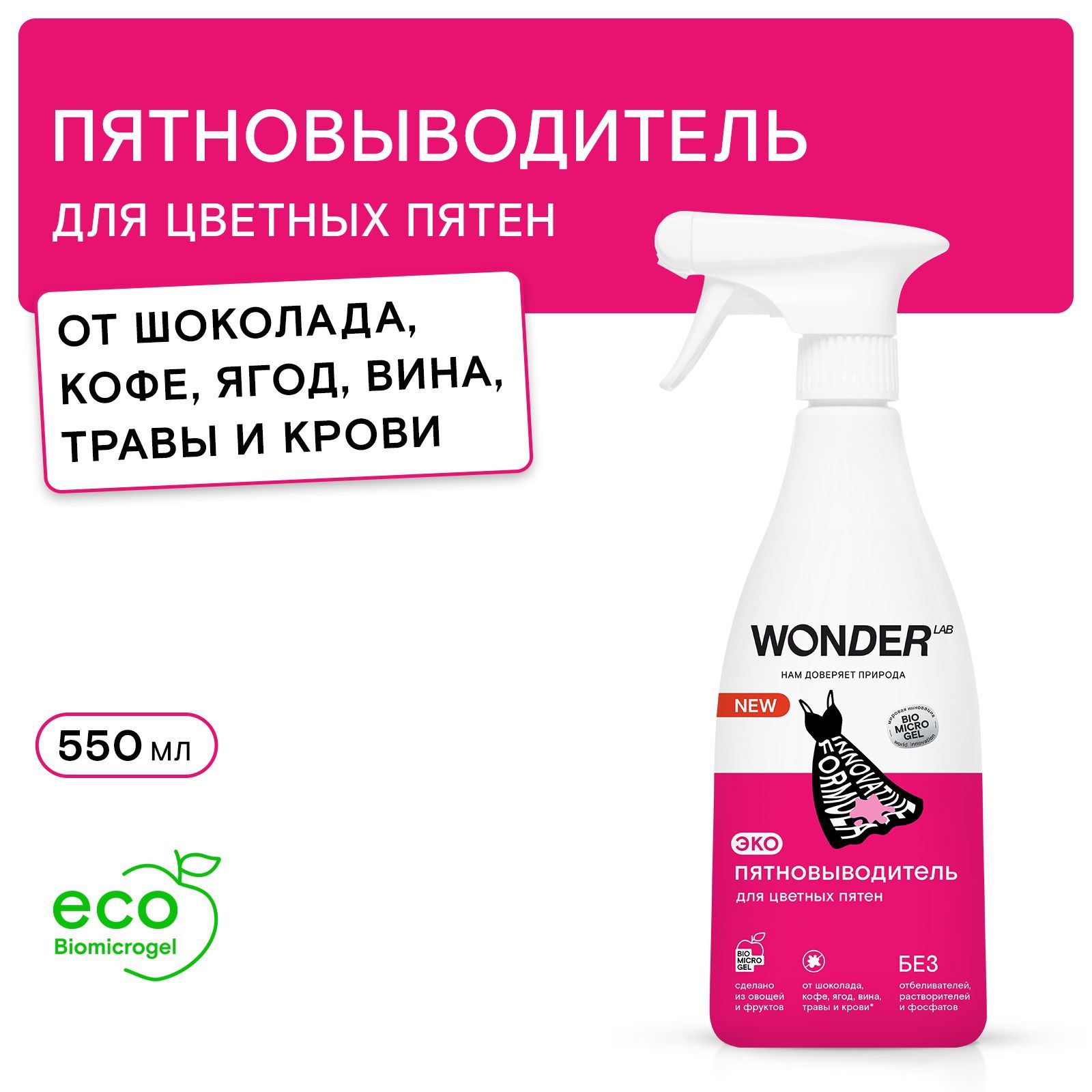 Дозатор в виде спрея позволяет точечно направлять средство на пятна, благодаря чему пятновыводитель расходуется экономично. Экопятновыводитель и другие средства WONDER LAB не содержат токсичных компонентов, опасных для природы или человека. И всё это благодаря инновационному компоненту Biomicrogel, который сделан из овощей и фруктов.