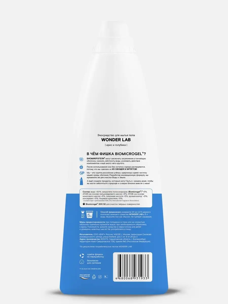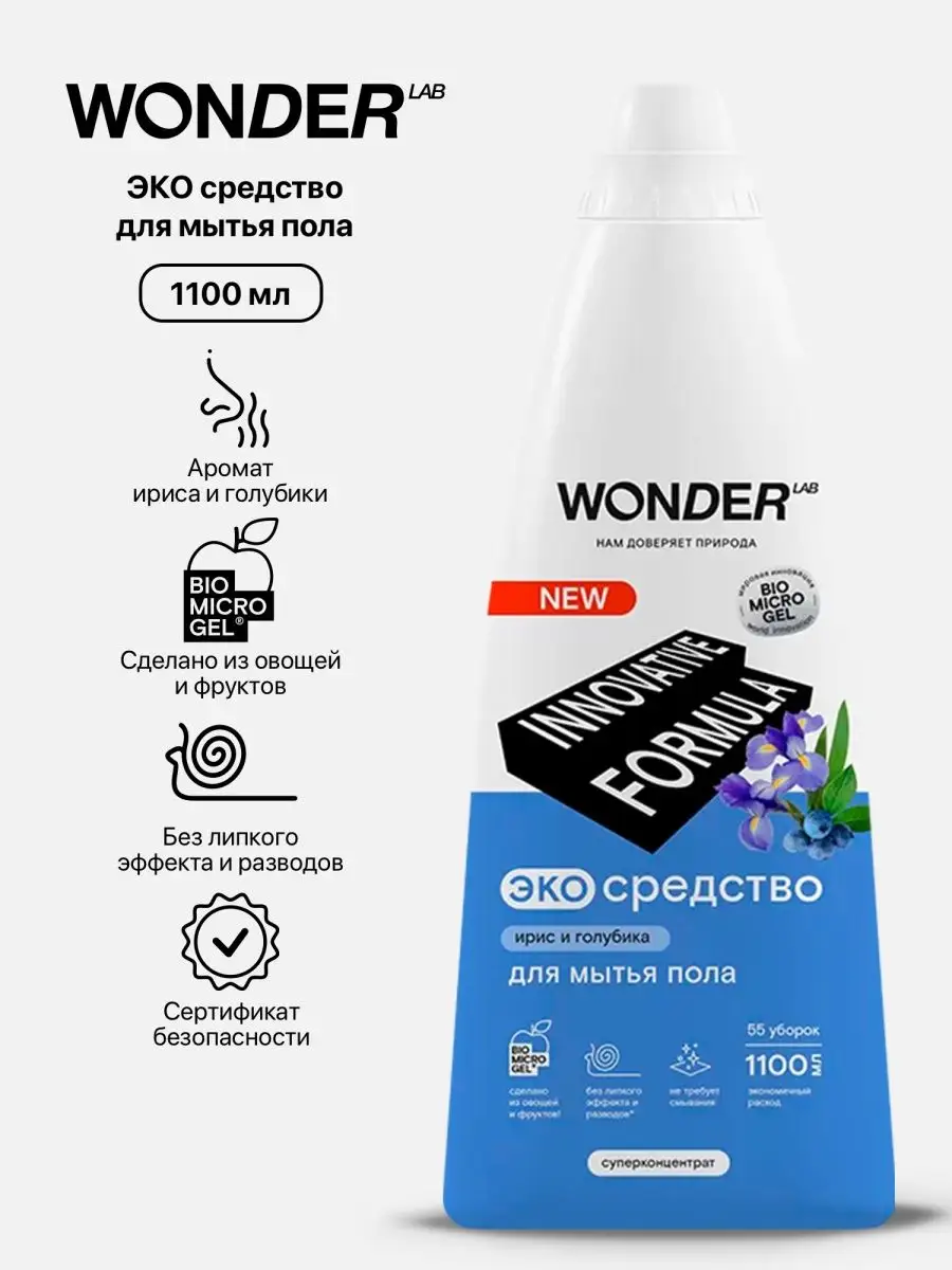 Описание: ЭКО средство для мытья пола объемом 1100 мл с ароматом ириса и голубики. Моющее средство для полов WONDER LAB со свежим ароматом листьев айвы и киви экономично расходуется, благодаря концентрированной формуле. Чистящее средство для пола подходит для любых типов напольных покрытий: ламинат, линолеум, керамическая плитка, мрамор, паркет. Средство оставляет легкий приятный аромат на поверхности, не требует смывания, не оставляет пленки и разводов. Отлично снимает статическое электричество и не создает «липкого» эффекта. Средство безопасно и эффективно для использования в домах с животными.