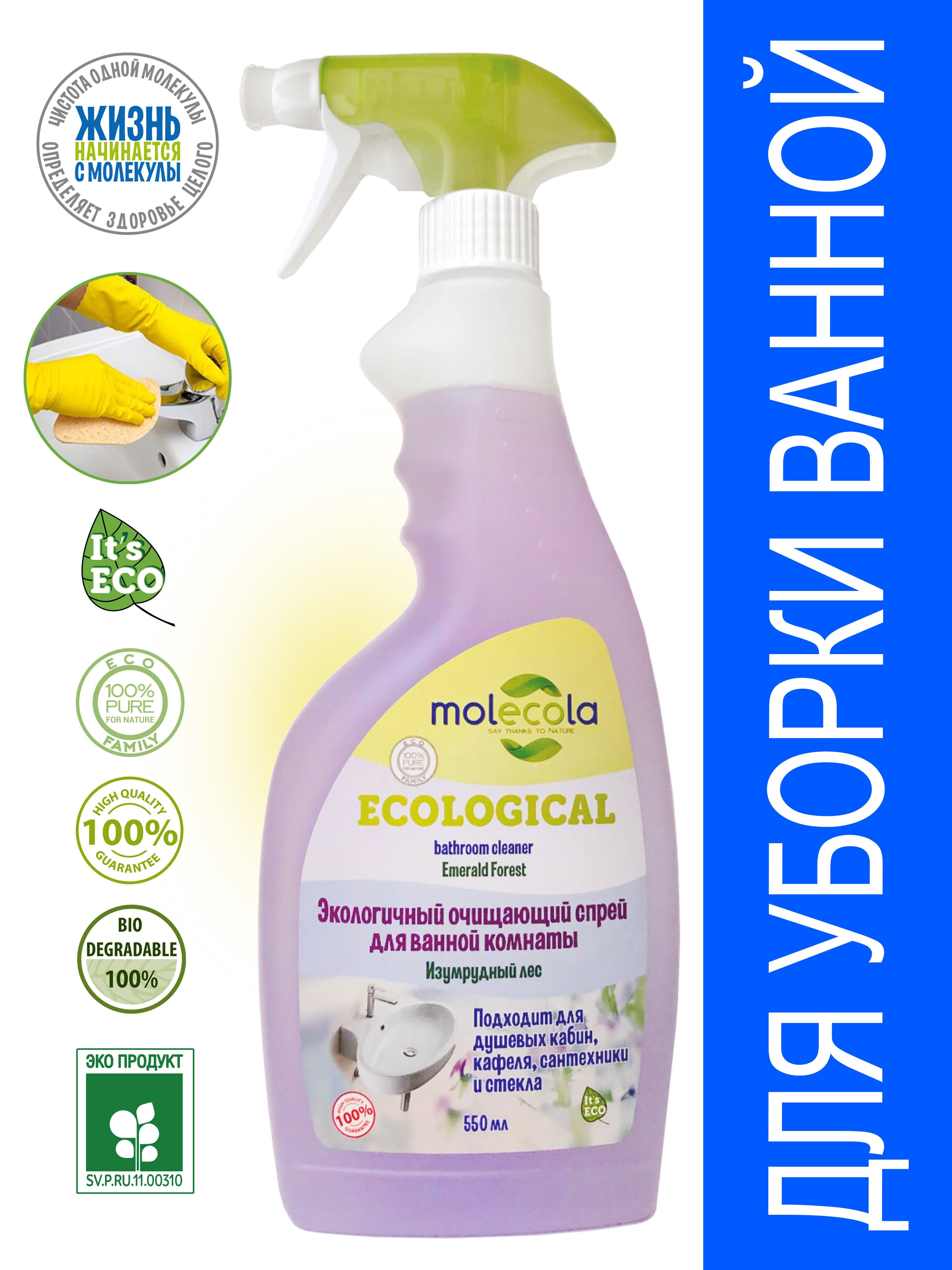 Описание: Экологичный очищающий спрей для ванной комнаты с приятным природным ароматом дезинфицирует и удаляет пятна со всех моющихся поверхностей в ванной комнате и туалете. Возможно выпадение осадка. Подходит для мытья душевых кабин. Подходит для мытья детских ванночек, горшков и других гигиенических принадлежностей. Удаляет известковый налет, остатки мыла, пятна ржавчины, жирные разводы, пятна органического происхождения, придает блеск и глянец, обладает антибактериальными свойствами. При регулярном применении предотвращает появление плесени. Спрей рекомендуется людям, имеющим аллергическую реакцию на средства бытовой химии. Новая формула на основе безопасных растительных ингредиентов обеспечивает высокую эффективность и экологичность использования. Покупая продукцию ТМ Molecola, вы участвуете в защите окружающей среды. Бутылка сделана из пластика, который подлежит вторичной переработке в России.