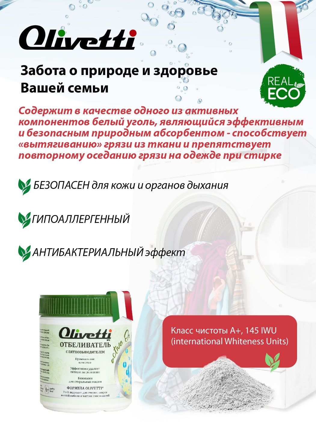 Премиальное качество отбеливателя-пятновыводителя Olivetti обеспечивает его легкое применение и качественный результат. Все средства по уходу за домом от Olivetti принадлежат к классу эффективности А+, обладая повышенным индексом международных единиц чистоты и белизны (свыше 130), что более чем на 30 единиц выше среднего значения.