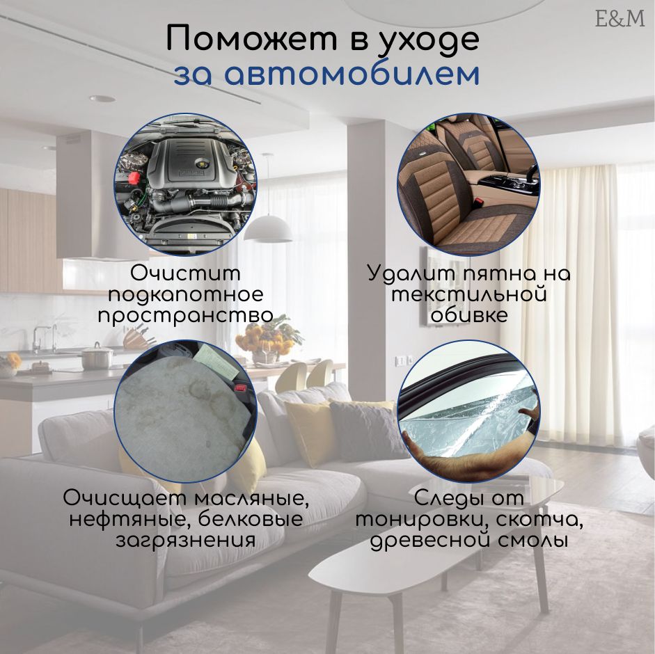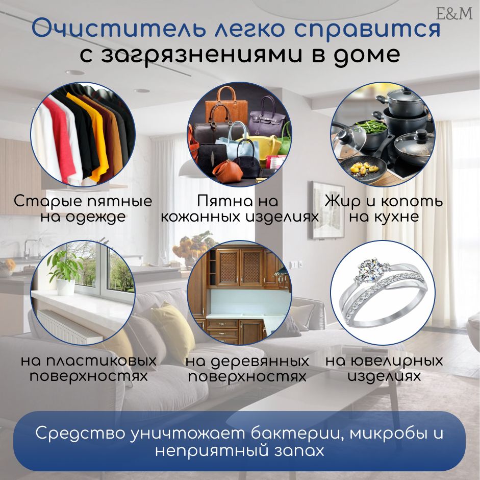 Спрей справится с загрязнениями на различных видах тканей, вернет блеск ювелирным изделиям, станет незаменимым помощником в доме, автомобиле и офисном помещении.