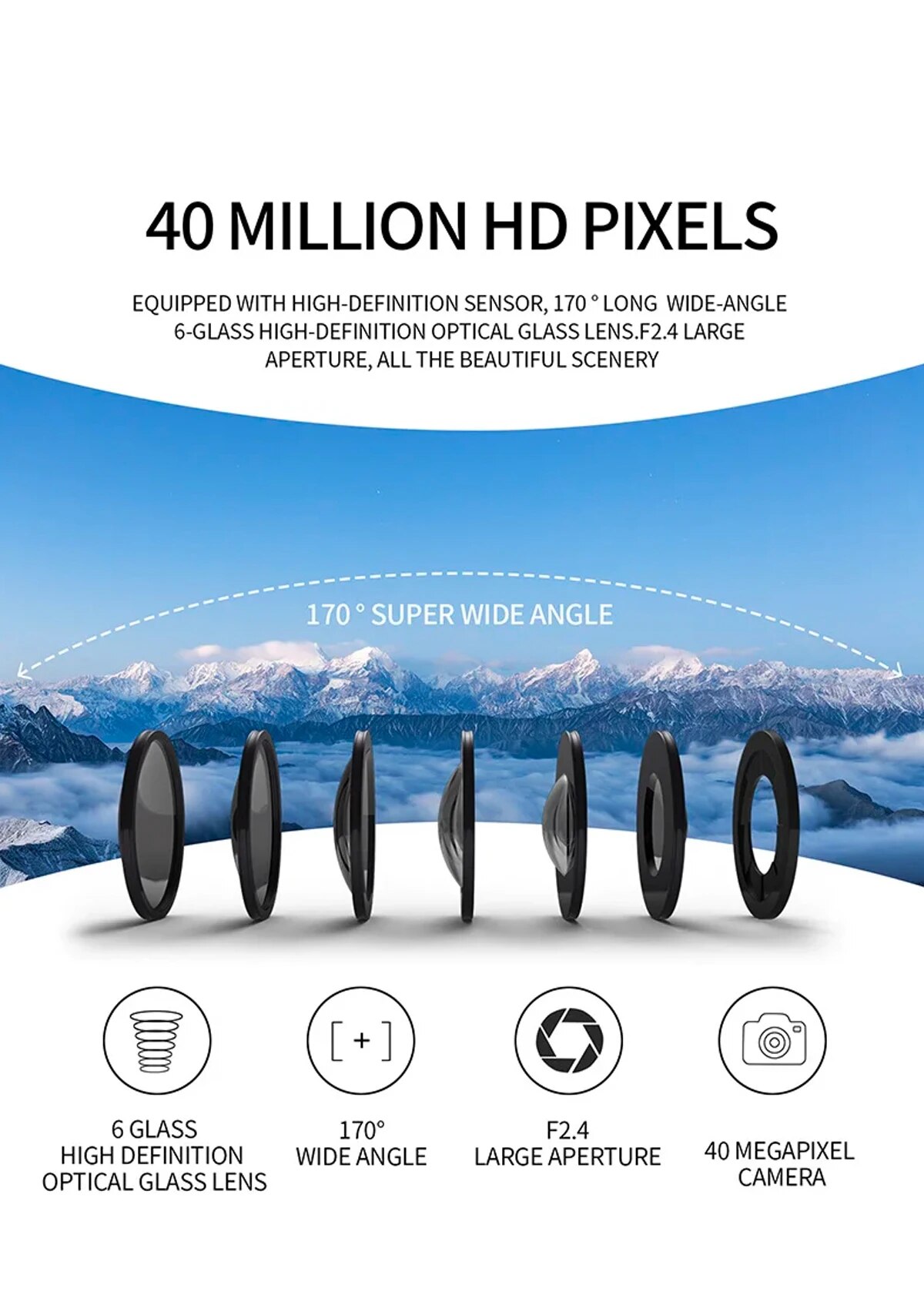 170 ° Широкоугольный 6 стеклянных линз:Индивидуальные асферические линзы. Широкое визуальное восприятие.