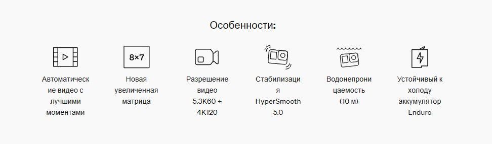 3 микрофона | Микрофонный разъем 3,5 мм через медиамодуль для HERO11 Black или профессиональный адаптер микрофона 3,5 мм (приобретается отдельно) | Запись звука RAW (формат .wav)