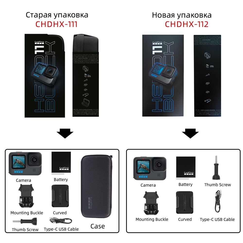 • Информация о продуктеВ комплектацию входят камера HERO11 Black, аккумулятор Enduro, изогнутые клеящееся крепления, крепежная пряжка + крепежный винт и кабель USB-C