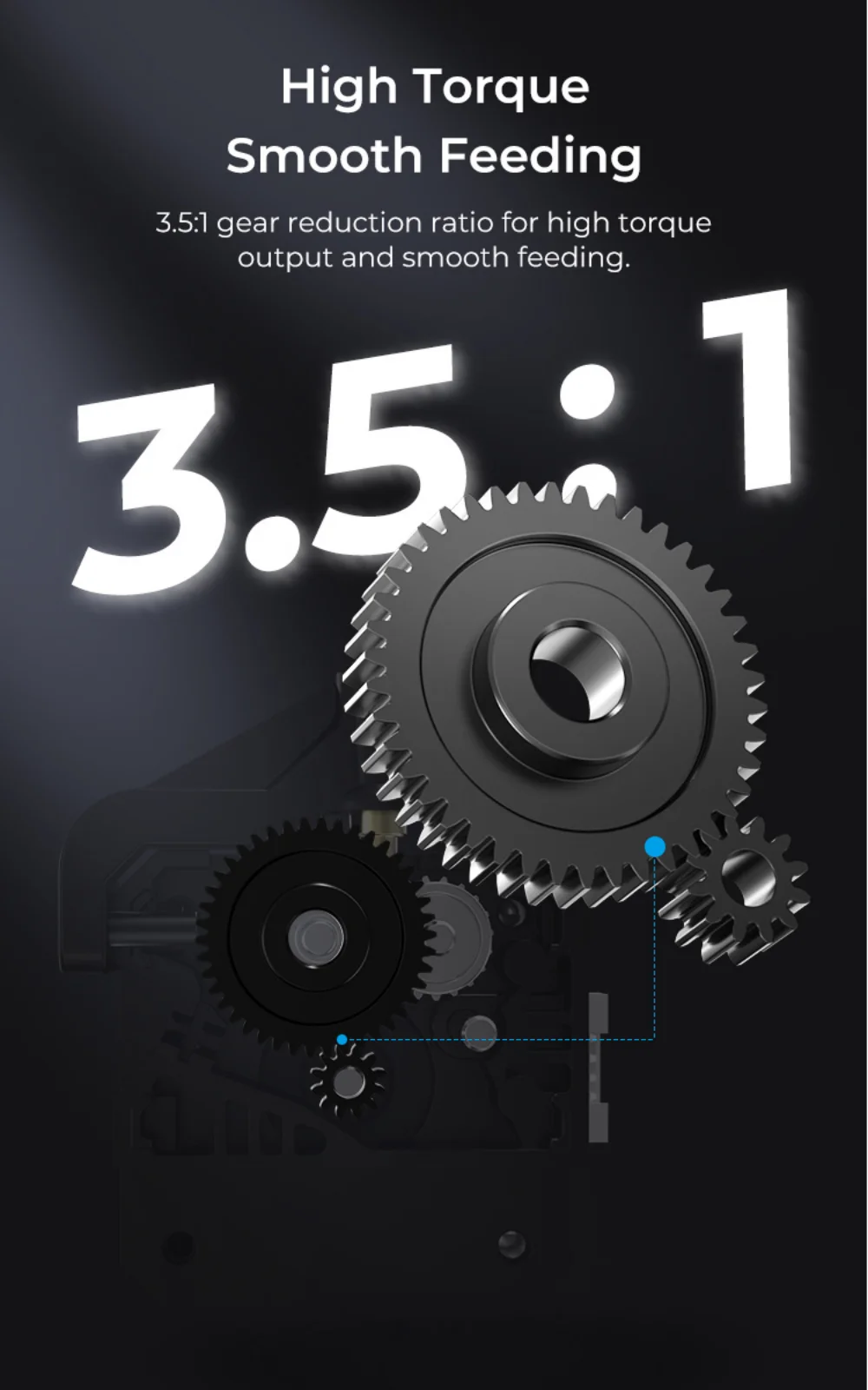 Двойная зубчатая конструкция не повреждает нити и обеспечивает более надежную и стабильную подачу во время печати.