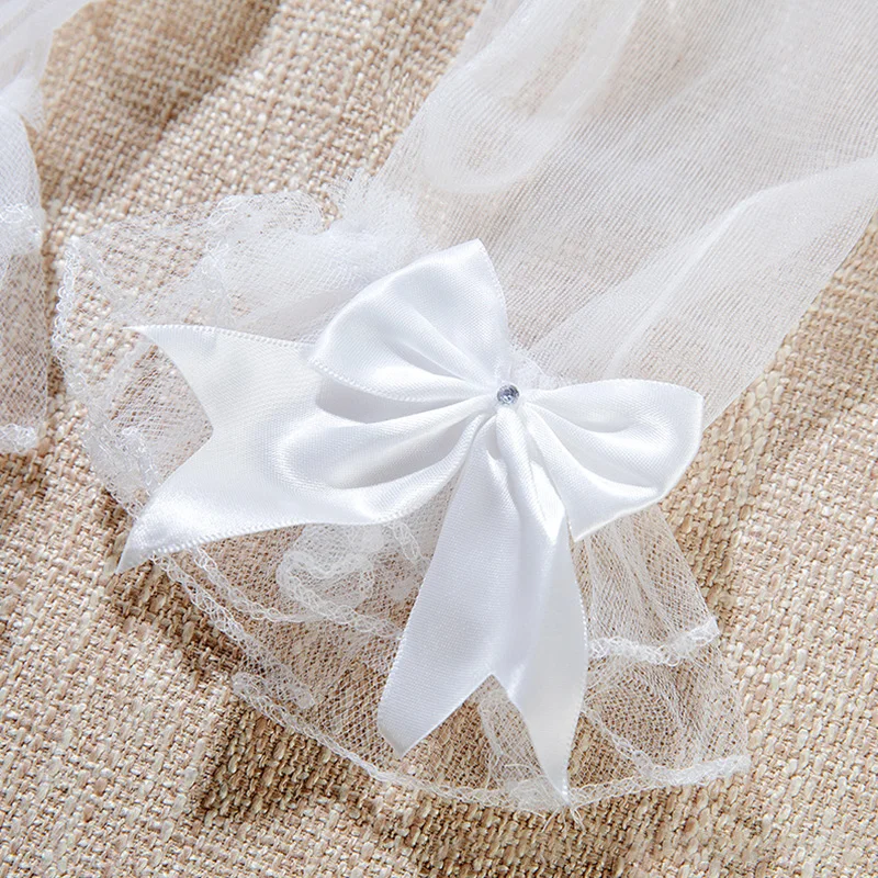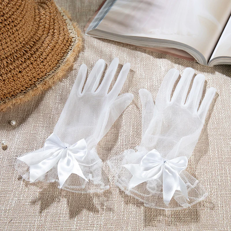 Элегантные женские перчатки, кружевные перчатки с бантом и закрытыми пальцами, Короткие тюлевые перчатки, свадебные перчатки, белые варежки, свадебные перчатки, вечерние принадлежности
