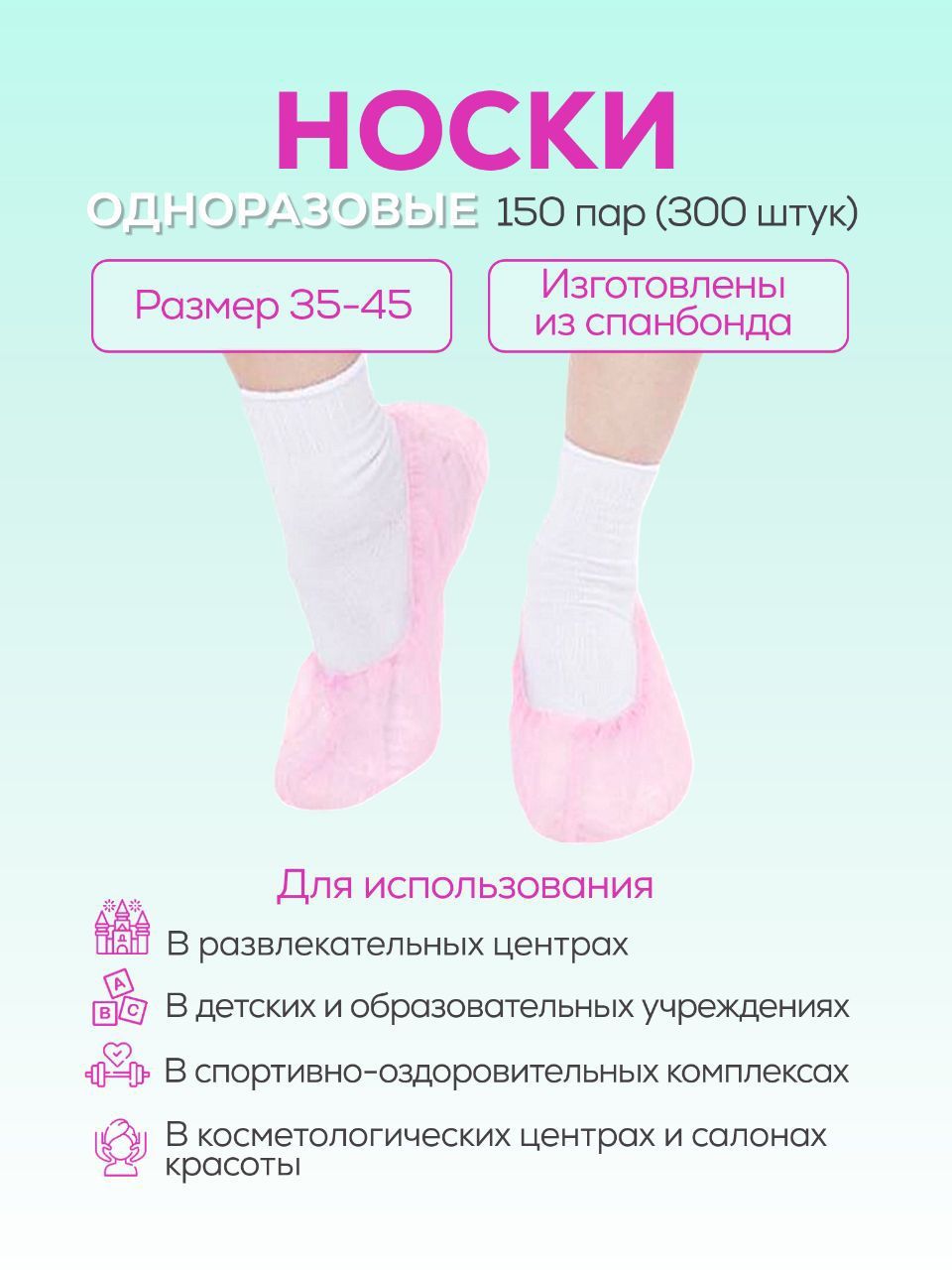 Описание: Одноразовые носки розовые и белого цвета из нетканого материала используются как в гигиенических целях, так и для защиты напольных покрытий от царапин и грязи. Применяют в обувных магазинах, спортивно-развлекательных комплексах, медицинских учреждениях и салонах красоты. Носки-бахилы Чистовкин изготовлены из гипоаллергенного нетканого материала (спанбонд), надежно защищает стопы от влаги, различных видов загрязнений, грибковых и бактериальных заболеваний, при этом он не препятствует циркуляции воздуха. Удобные бахилы из спанбонда эластичны, подходят для размера ноги от 35 до 48. Носки одноразовые для боулинга снабжены резинкой, что обеспечивает их надежную фиксацию. Количество пар в комплекте 150. Каждая пара - в индивидуальной упаковке. Одноразовые носки широко используются в косметологических центрах и салонах красоты, в детских и образовательных учреждениях, в поликлиниках и стационарах. Одноразовые носочки розовые носки мужские одноразовые носки бахилы женские одноразовые носочки Одноразовые носки из спанбонда используются как в гигиенических целях, так и для защиты напольных покрытий от царапин и грязи. Их применяют в обувных магазинах, спортивно-развлекательных комплексах, медицинских учреждениях и салонах красоты. Носки-бахилы Чистовкин изготовлены из гипоаллергенного нетканого материала (спанбонд), который надежно защищает стопы от влаги, различных видов загрязнений, грибковых и бактериальных заболеваний, при этом он не препятствует циркуляции воздуха. Носки для боулинга снабжены резинкой, что обеспечивает их надежную фиксацию. Количество пар в комплекте – 150, размер – универсальный. Каждая пара - в индивидуальной упаковке.
