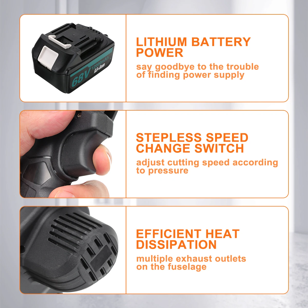 1. Использование одной рукой: корпус бензопилы составляет около 900 г, Общая длина составляет около 38 см. Можно управлять и использовать d одной рукой. Женщины также могут легко контролировать и использовать его, не уставать после долгих часов работы.