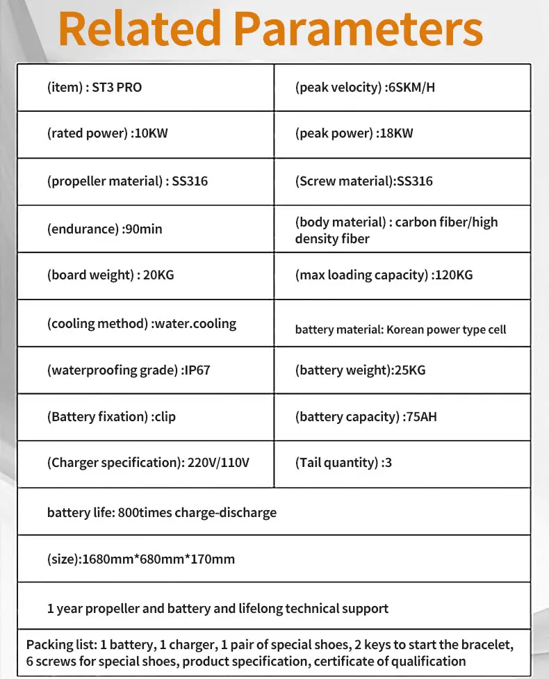 • Долговечность и безопасность, прочная конструкция из полимерных волокон и надежная система водяного охлаждения, эргономичные подножки, защитные поводки и удобная резиновая подушка для тяги. Эту электрическую доску для серфинга легко транспортировать и маневрировать в воде, что делает ее идеальной для гонщиков всех размеров.