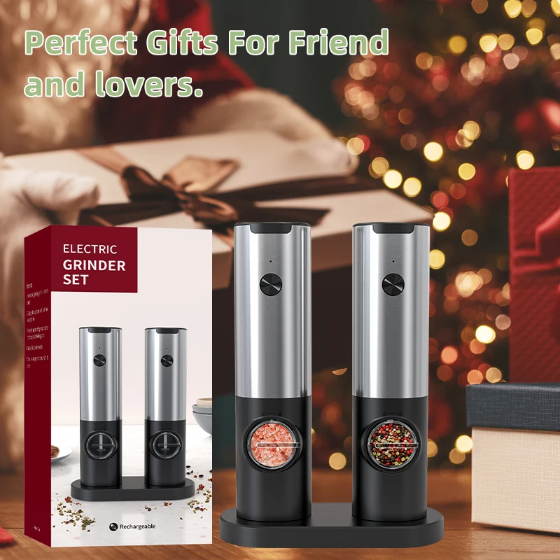 Перезаряжаемая электрическая мельница для соли и перца Набор USB-Зарядная база Автоматическая мельница для специй из нержавеющей стали со светодиодной мельницей для перца