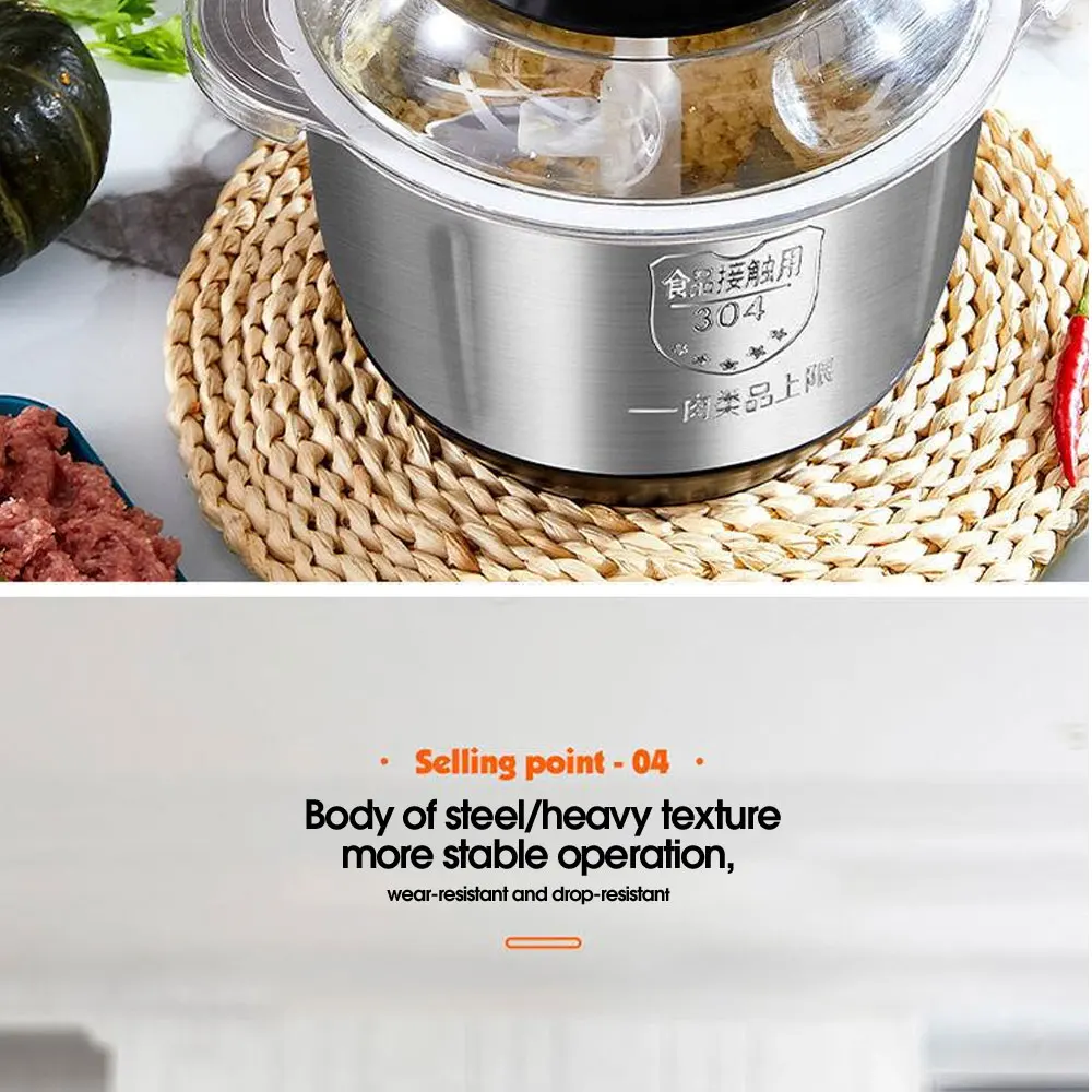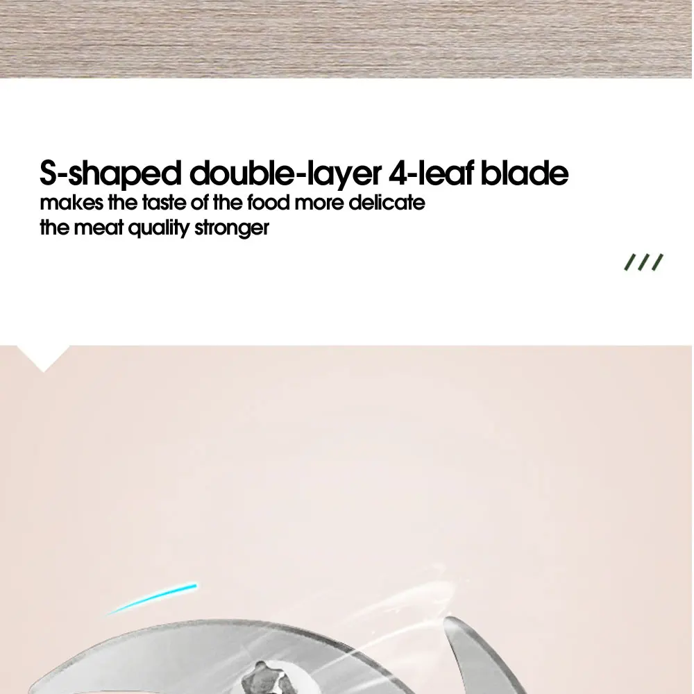 Этот Электрический измельчитель оснащен 300-ваттным двигателем из чистой меди и 4 острыми лезвиями из нержавеющей стали, что позволяет быстро измельчать, смешивать, смешивать и измельчать различные ингредиенты.
