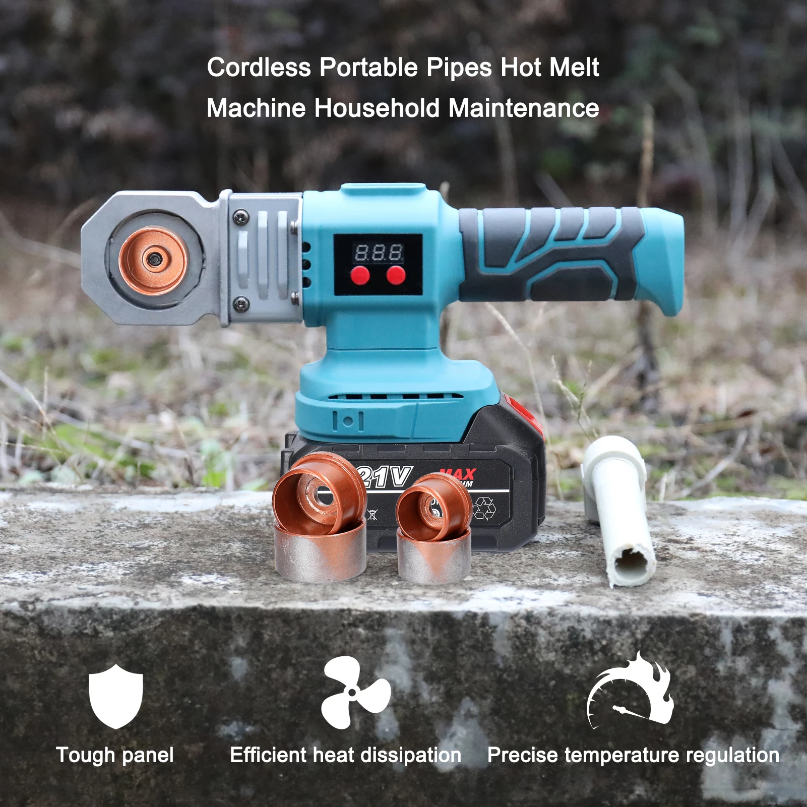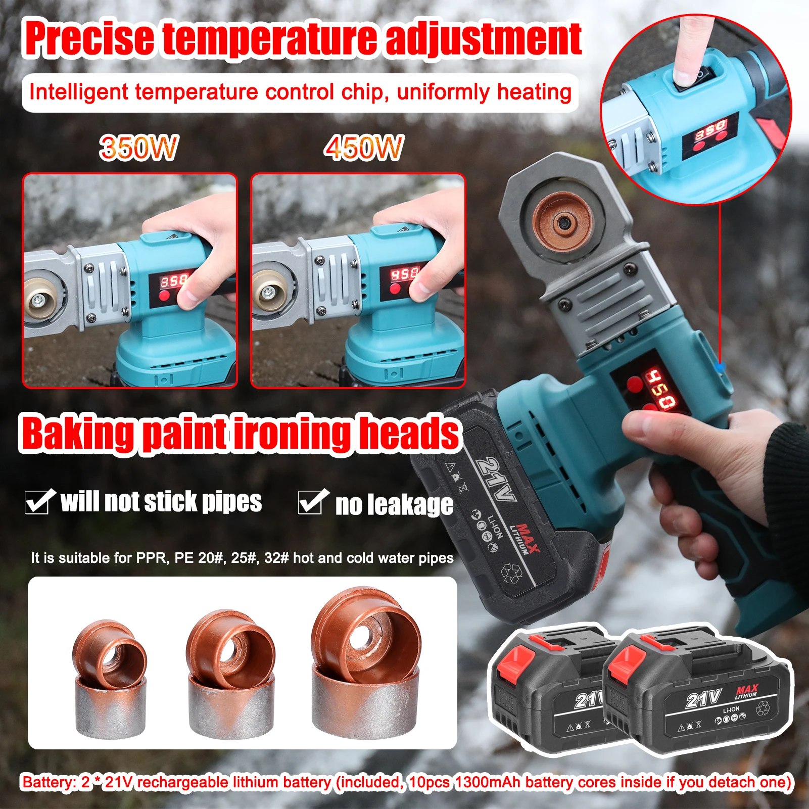 Это устройство для плавления водопроводных труб имеет высокую мощность, быстрый нагрев, высокую эффективность, равномерную и стабильную теплопроводность. Интеллектуальный чип контроля температуры, равномерный нагрев, поддержка точной регулировки температуры 350-450 ℃. Оснащен 3 различными характеристиками гладильных головок: 20 мм, 25 мм и 32 мм, их легко изменить в зависимости от использования. Питание от литиевой батареи (не входит в комплект), беспроводное и удобное, не будет ограничено источниками питания, удобно для использования в трубах горячей воды при отсутствии источников питания.