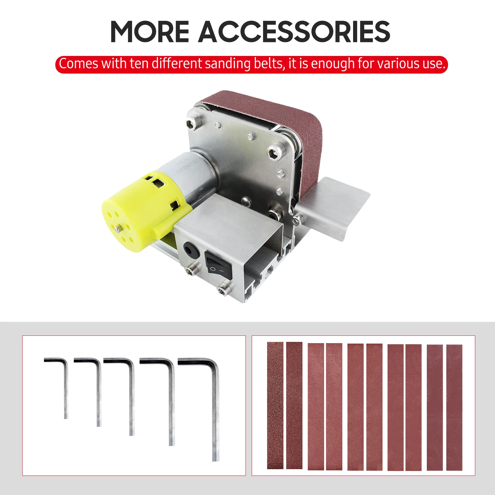 More accessories: in addition belt sander and power adapter, it comes with five wrench and ten different sanding belts, enough for various use.