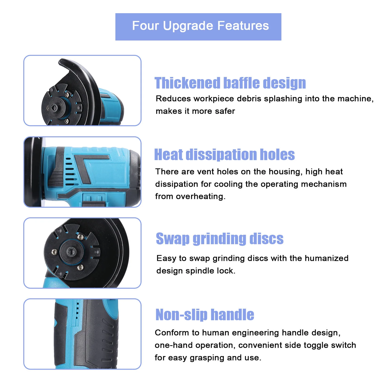Это своего рода Многофункциональный шлифовальный инструмент с более стабильной и плавной работой, обеспечивающий длительный срок службы. Принимает бесщеточный двигатель, который не генерирует искры во время работы, и двигатель не изнашивается, может обеспечить длительный срок службы. Высокая скорость вращения 15000 об/мин для надежной и продуктивной работы. Его можно использовать для кондиционирования и шлифования поверхности или резки железа, а также для обустройства дома, например, для резки и полировки керамической плитки, дерева, камня, стали и т. Д.