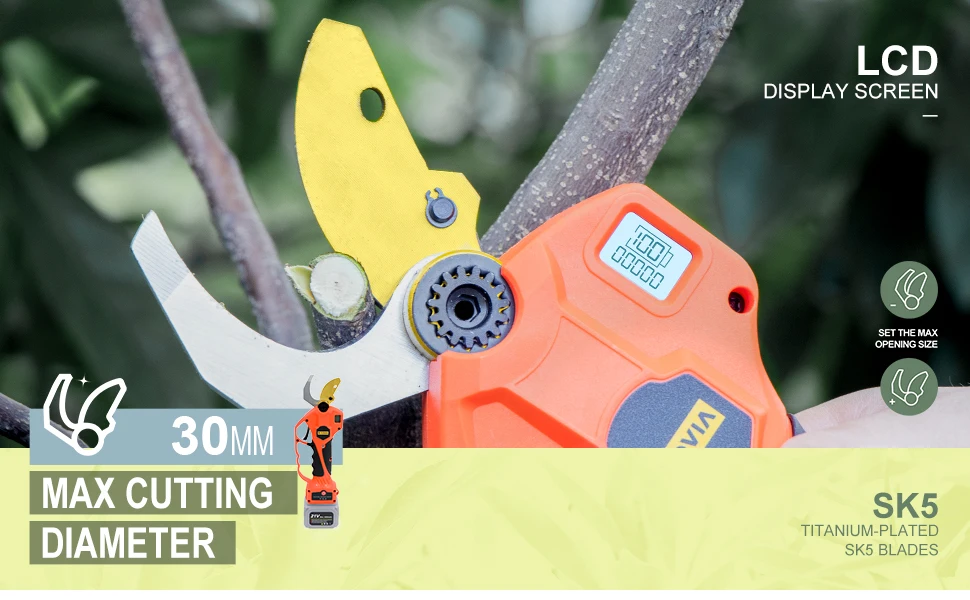 【ПОКРЫТИЕ ТИТАНОВЫМИ ЛЕЗВИЯ SK5 】В электрических секаторы T TOVIA используются передовые лезвия из высокоуглеродистой стали SK5, что делает их сверхострыми, не содержащими ржавчины и очень прочными. Диаметр резания может быть повторно установлен за секунды нажатием спускового крючка между большим (1,2 дюйма/30 мм) и средним (0,8 дюйма/20 мм). Для вашего удобства в комплект входит второе режущее лезвие SK5 вместе с гаечным ключом, необходимым для замены лезвия.