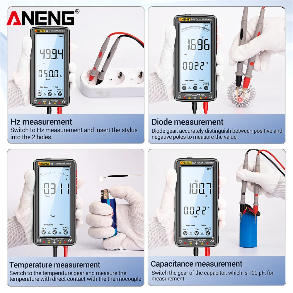 Измеритель электрической емкости Анти-ожог Гц Ом диодный метр 6000 отсчетов Перезаряжаемый фонарик Освещение ЖК-экран для автомобилей