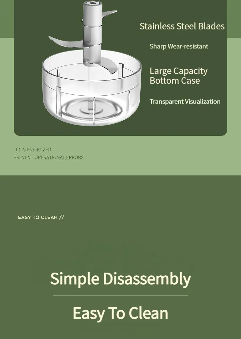 Электрическая давилка для чеснока с лезвием из нержавеющей стали прочна и долговечна для быстрого измельчения ингредиентов. Вы можете быстро нарезать чеснок, специи, орехи, овощи, мясо, лед и т. Д. Он отлично подходит для небольших продуктов. Примите технологию индукционного включения, снимите крышку при автоматическом индукционном выключении, избегайте случайных травм. Чесночное пюре легко снимается, а чашу и лезвие можно разделить для облегчения очистки.