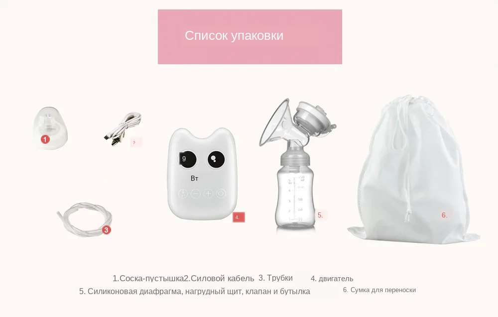 1. Соска 2. Кабель питания 3. Трубки 4. Двигатель 5. Силиконовая мембрана, защита груди, клапан и бутылочка 6. Сумка