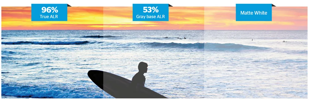 Экран ALR в этой области оставляет открытым рот (над черным алмазным ALR 8K, вниз матовый белый экран усиления 1, половина экрана). Как только вы опустите ALR перед белым экраном, разница в черном уровне более чем заметна...