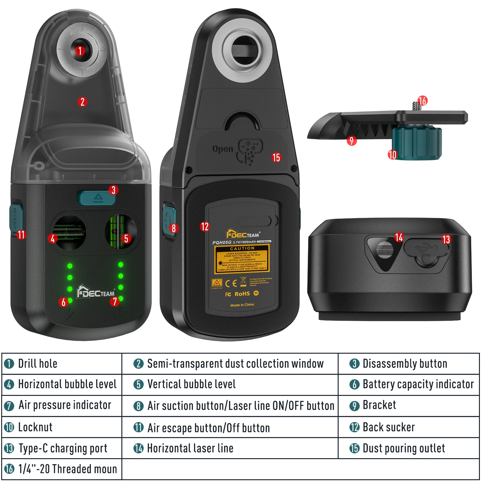 В комплект поставки входит настенный кронштейн, подходит для крепежной нити 1/4 "-20, оснащенной монтажной резьбой 5/8"-11 и сменной уплотнительной лентой. Пылеуловитель может использоваться отдельно в качестве пылесборника и кронштейна, вы можете удалить или установить пылесборник или стоять нажатием кнопки. При использовании в качестве подставки его можно использовать с другими лазерными уровнями, проекторами и камерами с максимальной нагрузкой 5 кг.