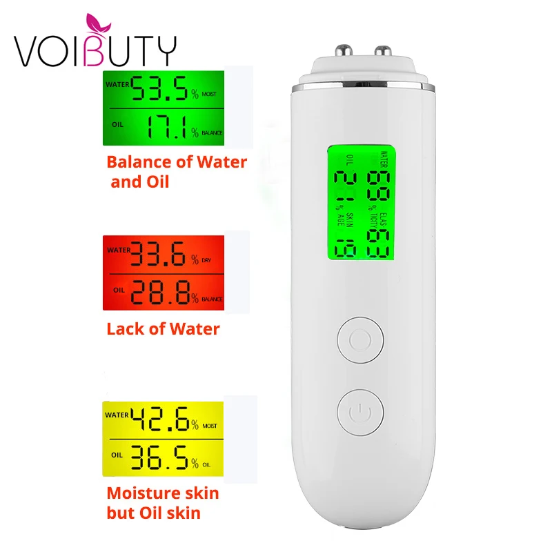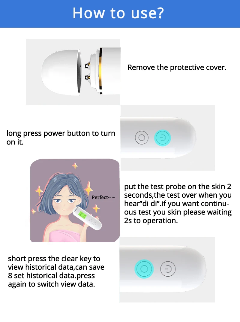 2) Снимите при отсутствии влаги: красный свет. Нормальной кожи баланс влаги и масла: загорится желтый индикатор. Хорошая кожа баланс влаги и масла: зеленый свет.