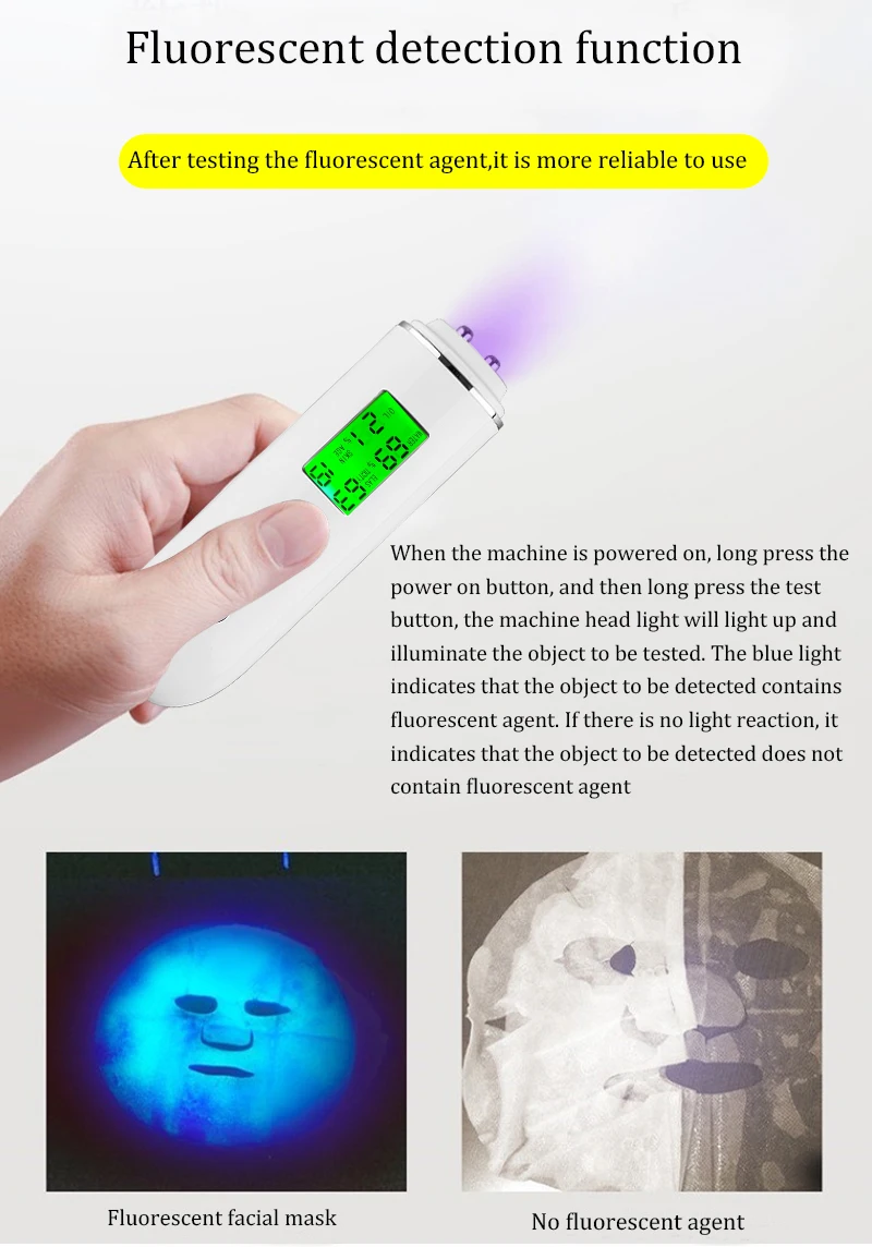 【Multiple Functions】Can использоваться для испытания влажности кожи, растительное масло, эластичность; может быть использован для тестирования температуры и влажности окружающей среды; С люминофора функции может быть использован для тестирования люминофора.