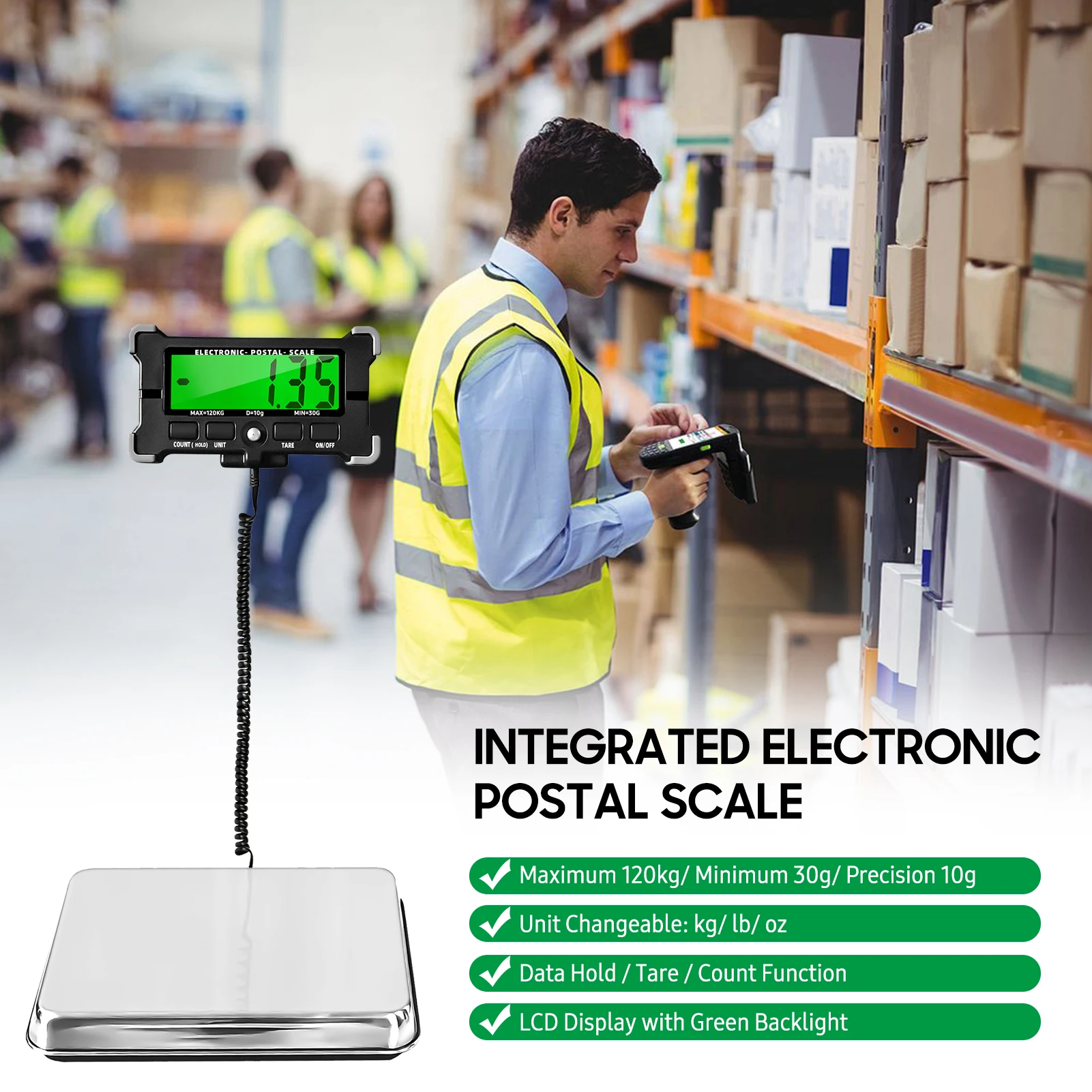 Электронные Почтовые весы подходят для доставки посылок. Благодаря емкости 120 кг (264,5 фунта), точности 10 г и ЖК-экрану с подсветкой вам удобно читать и работать. Он также имеет функцию удержания данных, функцию тары и функцию подсчета для удовлетворения различных требований при практическом использовании.