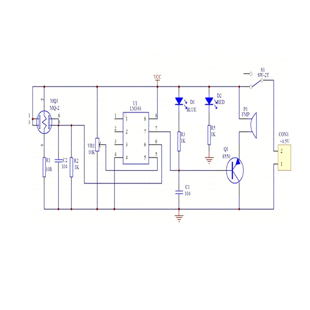 В дизайне этого набора знания о двух курсах «аналоговых электронных технологий» и «цифровых электронных технологий» используются для полного завершения дизайна курса. Схема показана как токсичная и вредная цепь газовой сигнализации. Он состоит из газового датчика, триггера и звуковой цепи сигнализации. Полупроводниковый газовый датчик принимает Тип QM-2, который требует только стабильного напряжения нагрева, который составляет около 5 В. Это значение напряжения может быть достигнуто путем регулировки W1 и R1. Кроме того, газовый датчик также может быть заменен на датчик, который особенно чувствителен к определенному вредному газу, а Напряжение нагрева различных типов датчиков отличается. Время разогрева составляет около 1 минуты во время отладки.