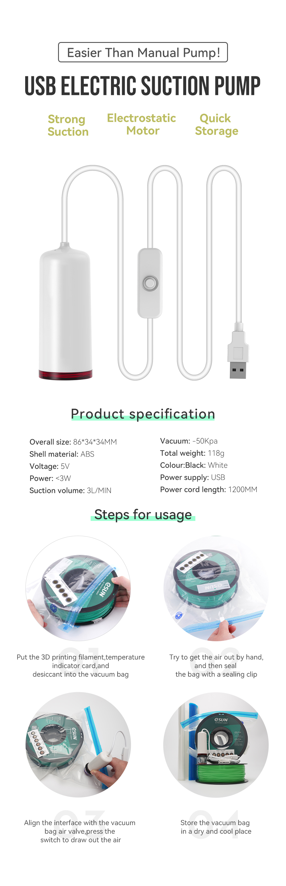 Комплект для хранения нити eSUN, влагостойкий вакуумный набор, вакуумные упаковочные пакеты для нити для 3D-принтера, сохраняющие сухость нити