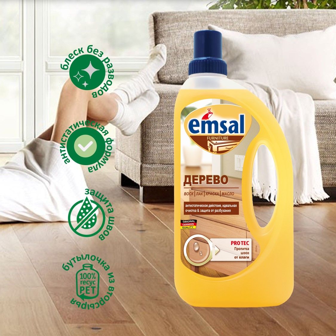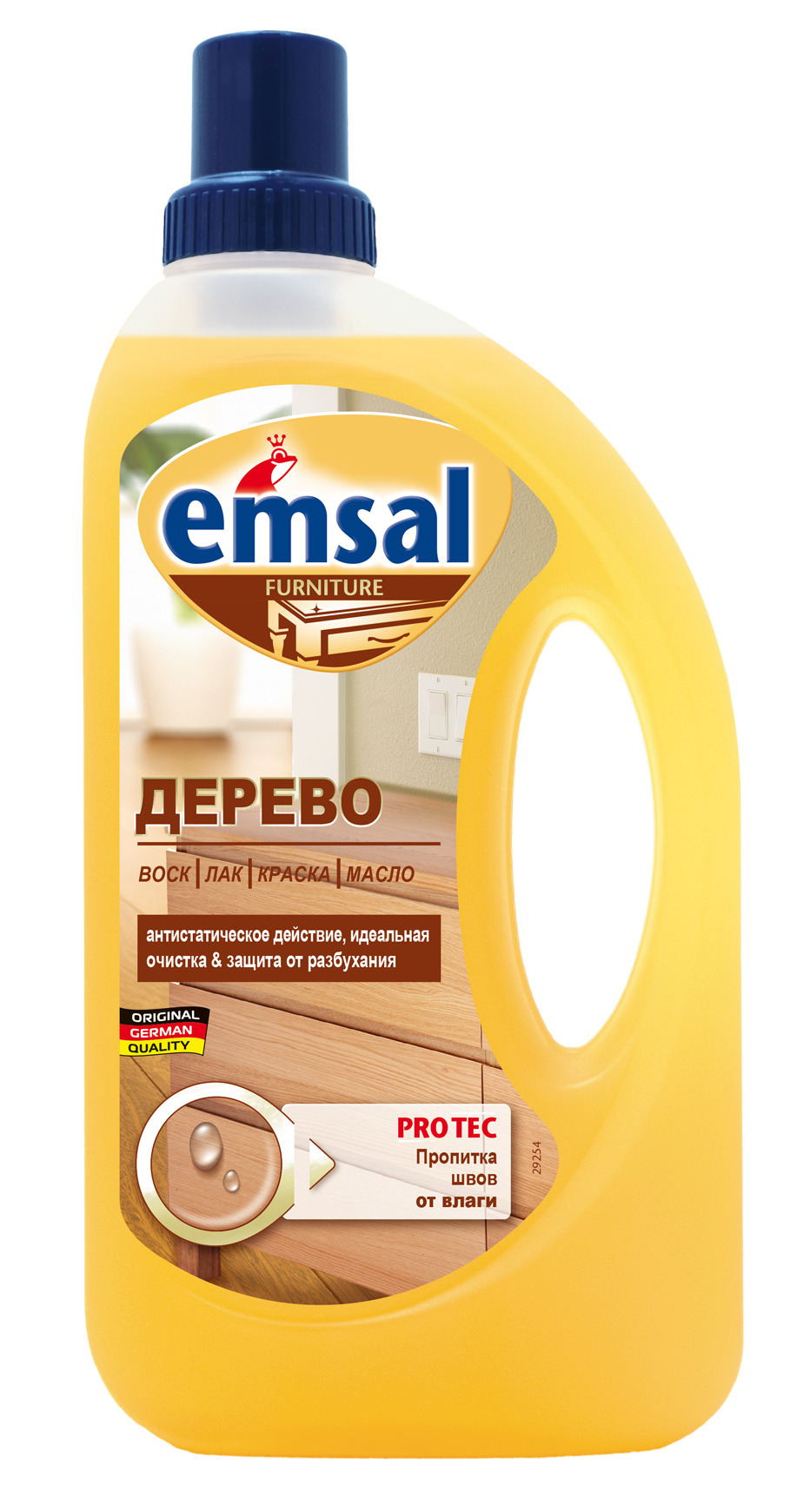 Описание: Чистящее средство Emsal идеально подходит для мягкого очищения и ухода за всеми моющимися деревянными поверхностями во всем доме: деревянными полами, деревянными рейками, деревянными дверями, мебелью, подоконниками, а также кухонными элементами. Подходит как для светлой, так и для темной древесины Уникальная рецептура с антистатической формулой не только удаляет трудновыводимую грязь и пятна, но и дольше оберегает вашу деревянную мебель от пыли.  Характеристики: