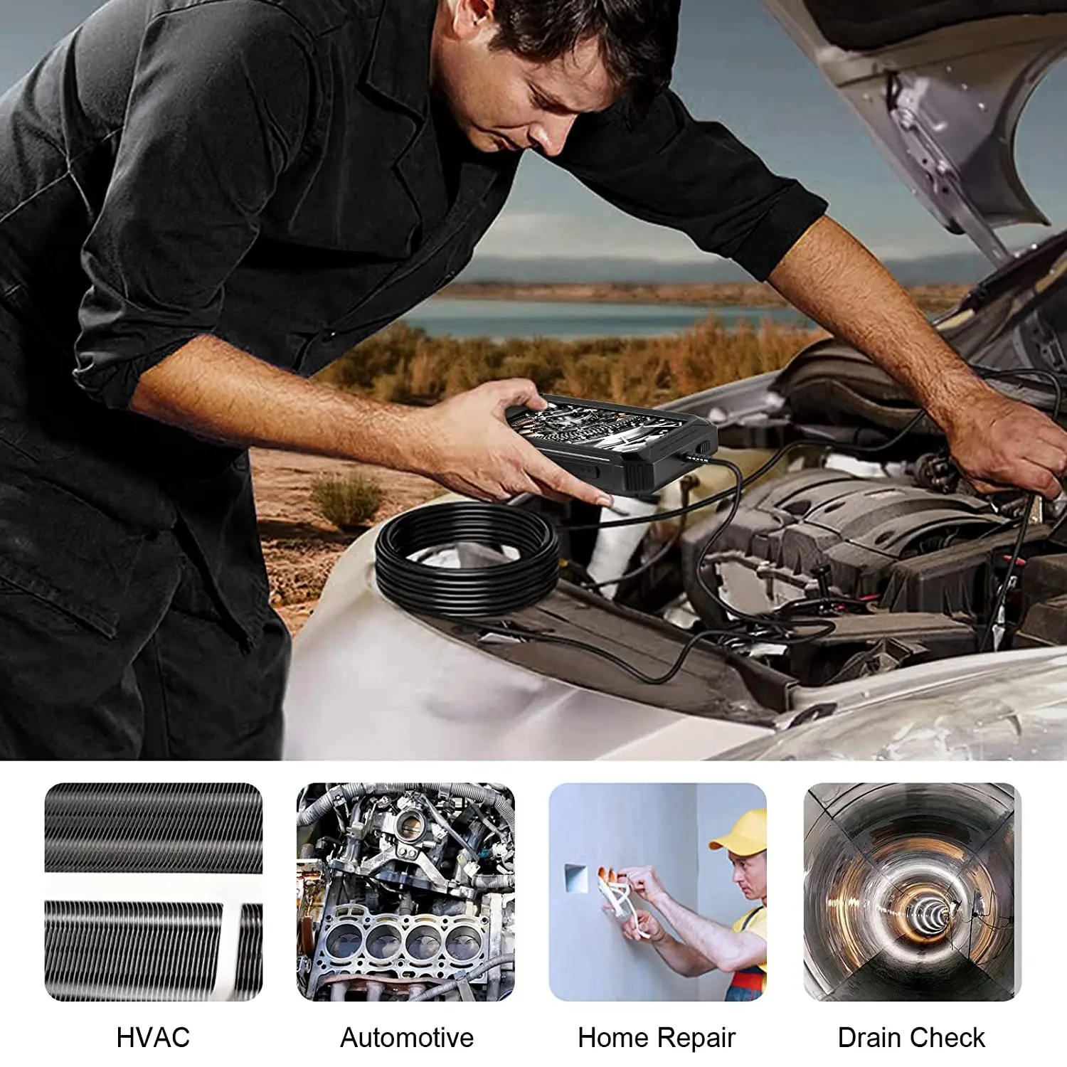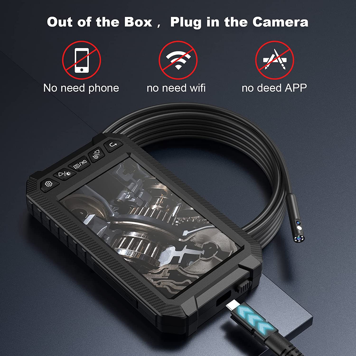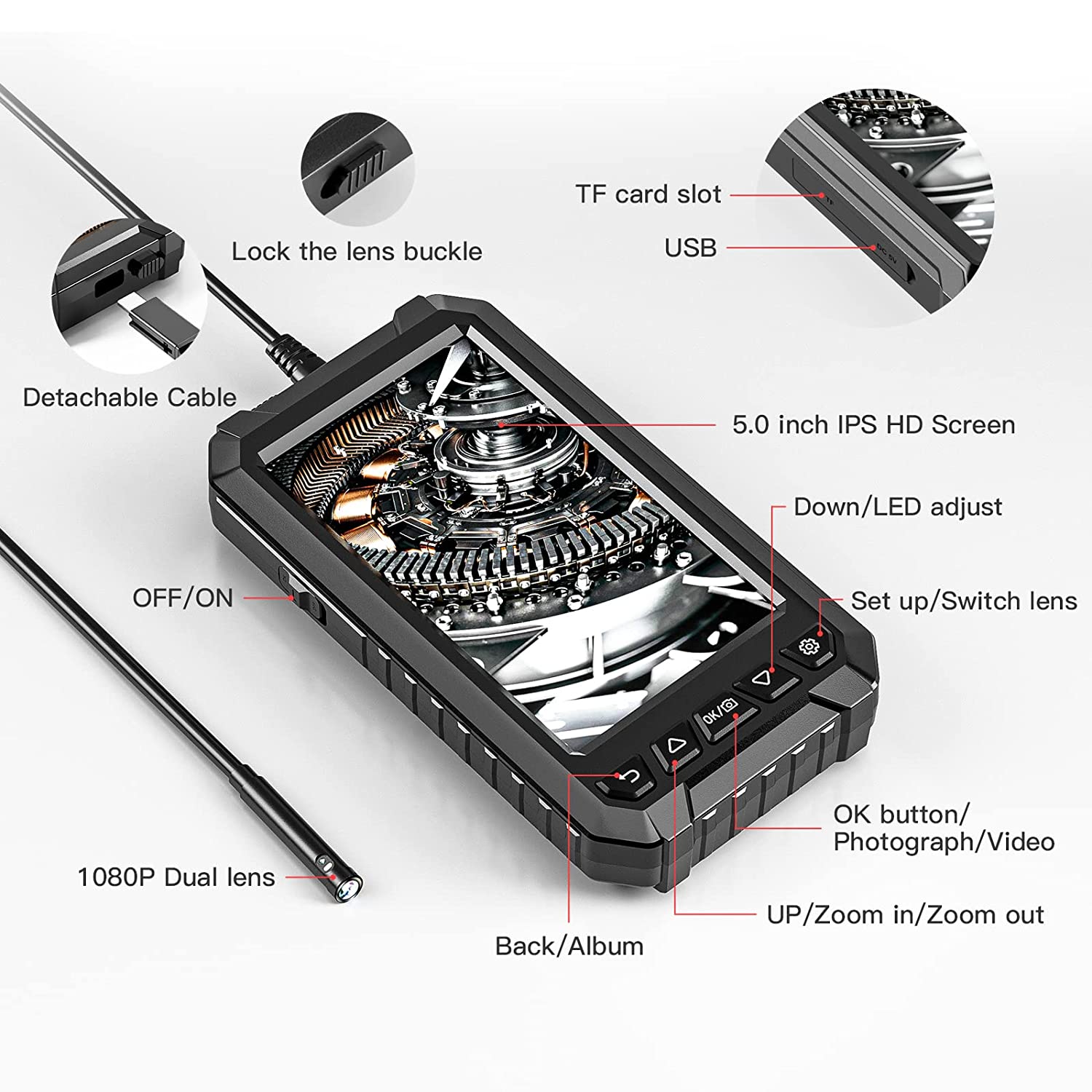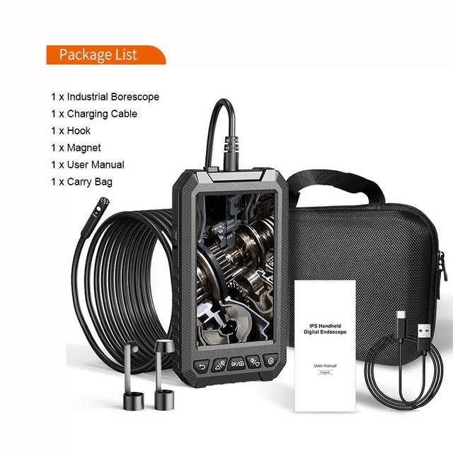 • [5 "цветной экран HD]: Бороскоп камеры разработан с 5 "IPS HD экраном, 5 дюймов экран может обеспечить более четкое и широкое представление. 7 светодиодный светильник с 3 регулируемыми режимами, идеально подходит для автомобилей, проверки дома и ОВКВ.