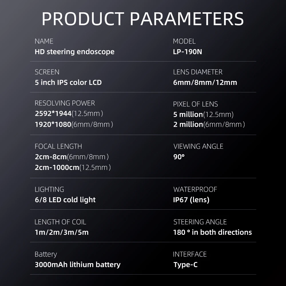 Эндоскоп рулевой промышленный, 5 МП, 12,5 мм, 3 м, 1080P