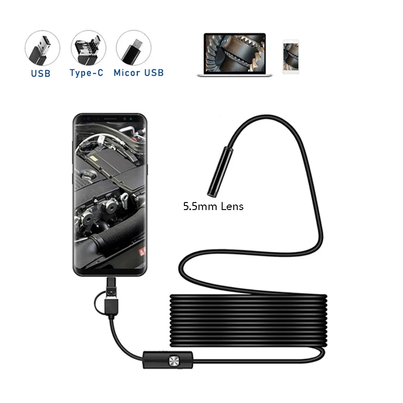 Эндоскопическая водонепроницаемая камера, проводной бороскоп с объективом 5,5 мм, длина 1/1,5/2 м, USB разъем типа С, светодиодная подсветка, для проверки труднодоступных мест