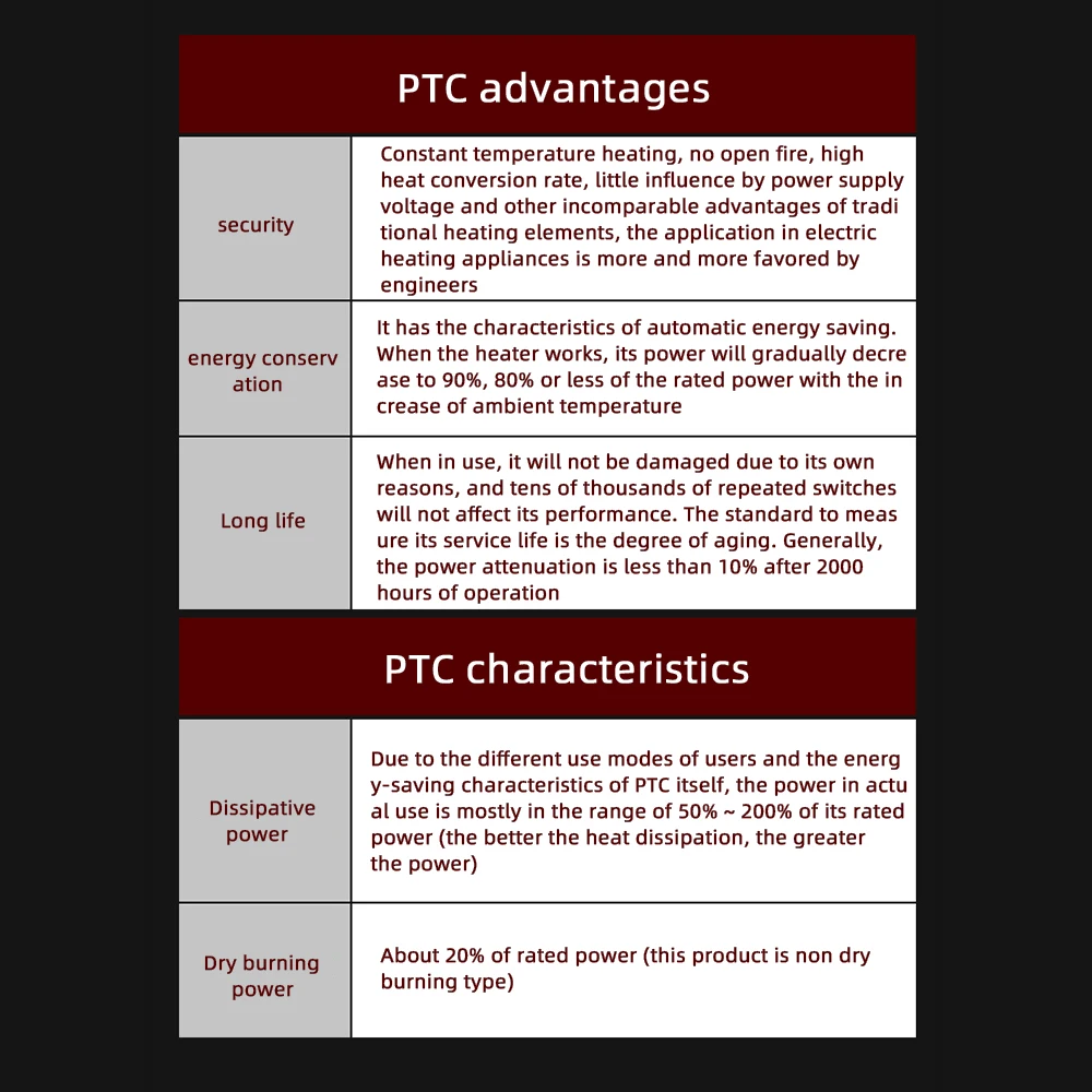 4. Быстрая реакция. После включения питания PTC быстро преобразует электрическую энергию в тепловую энергию, и вы можете почувствовать горячий воздух в течение 30 с