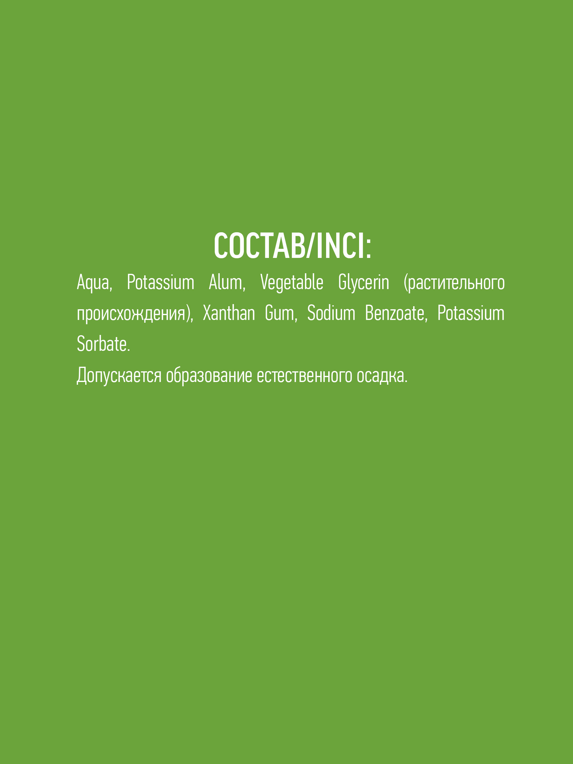 Aqua, Potassium Alum, Glycerin (растительного происхождения), Xanthan Gum, Caprylyl/Capryl Glucoside, Benzyl Alcohol, Ethylhexylglycerin.