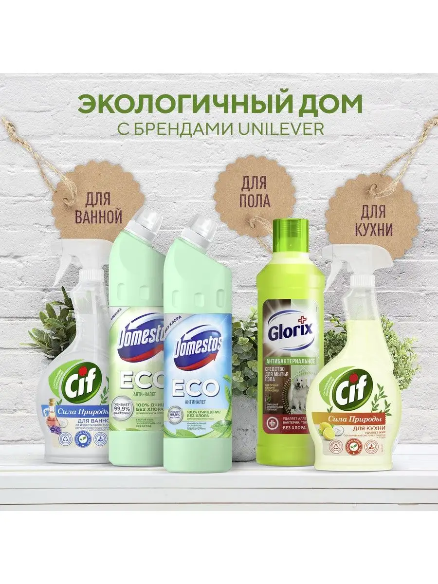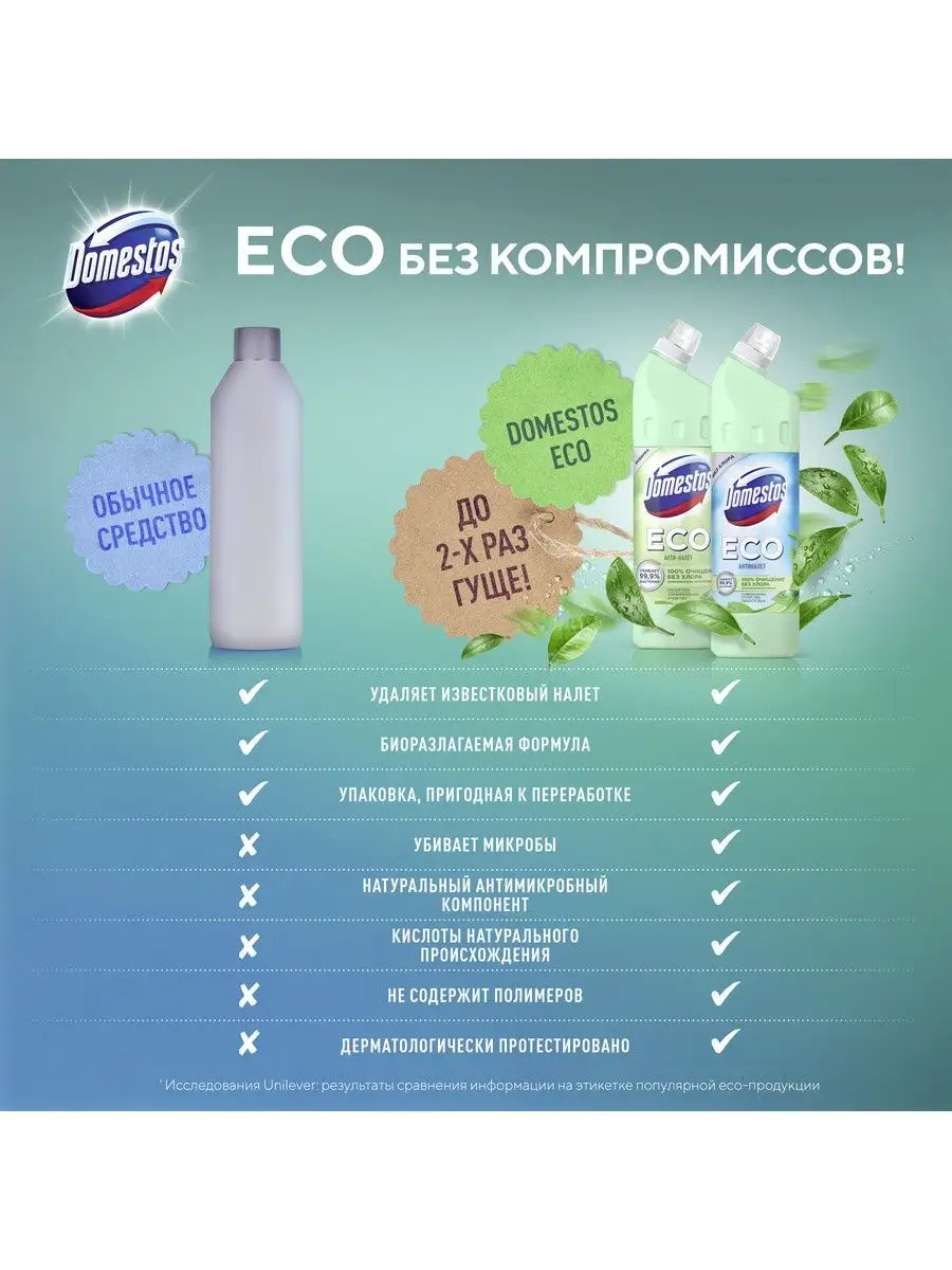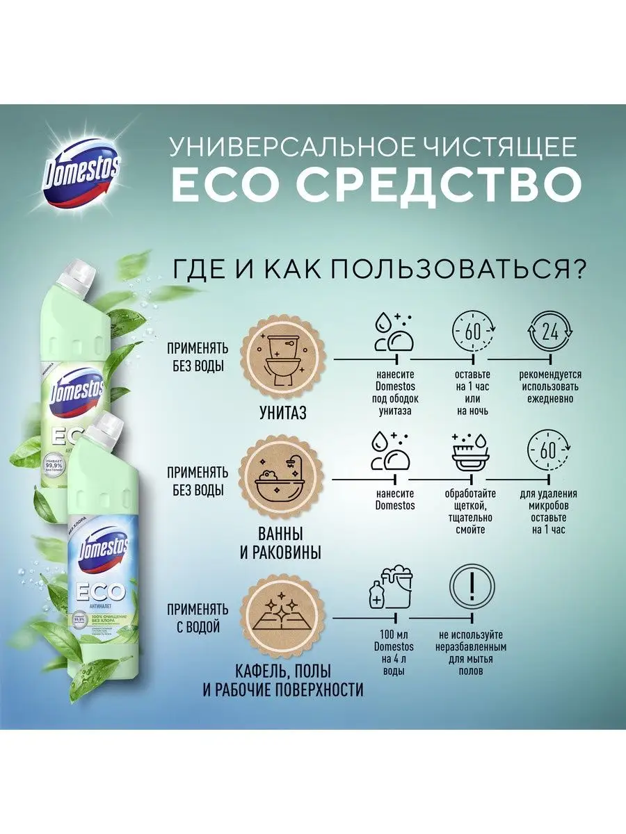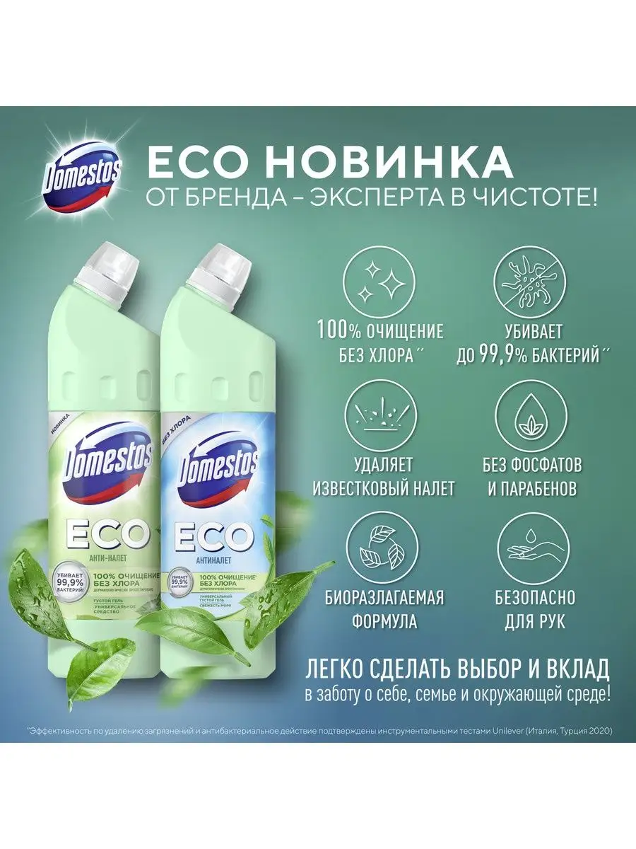 Описание: Выбирайте экологичное, эффективное и безопасное очищение - эко средство для сантехники Domestos ECO Антиналет Свежесть Моря без хлора. Это эффективные эко гели с приятным ароматом. Эко чистящие средства для уборки дома с формулой на основе лимонной кислоты удаляют сложные минеральные загрязнения, ржавые потеки и мочевой камень. Domestos ECO содержит антимикробный компонент природного происхождения, убивающий до 99,9% бактерий. Густая формула геля обеспечивает экономичный расход, не содержит ПАВы искусственного происхождения, хлор, фосфаты и парабены.Используйте эко гели для чистки унитаза и сантехники Антиналет Свежесть Моря для уборки дома: для ванной, устранения налета и подтеков на унитазе, мытья пола, кафеля и рабочих поверхностей. Доместос эко Антиналет без хлора содержит биоразлагаемые активные природные компоненты, а его упаковка полностью пригодна к переработке. Универсальное эко средство дерматологически протестировано и допускает уборку с использованием геля без перчаток.