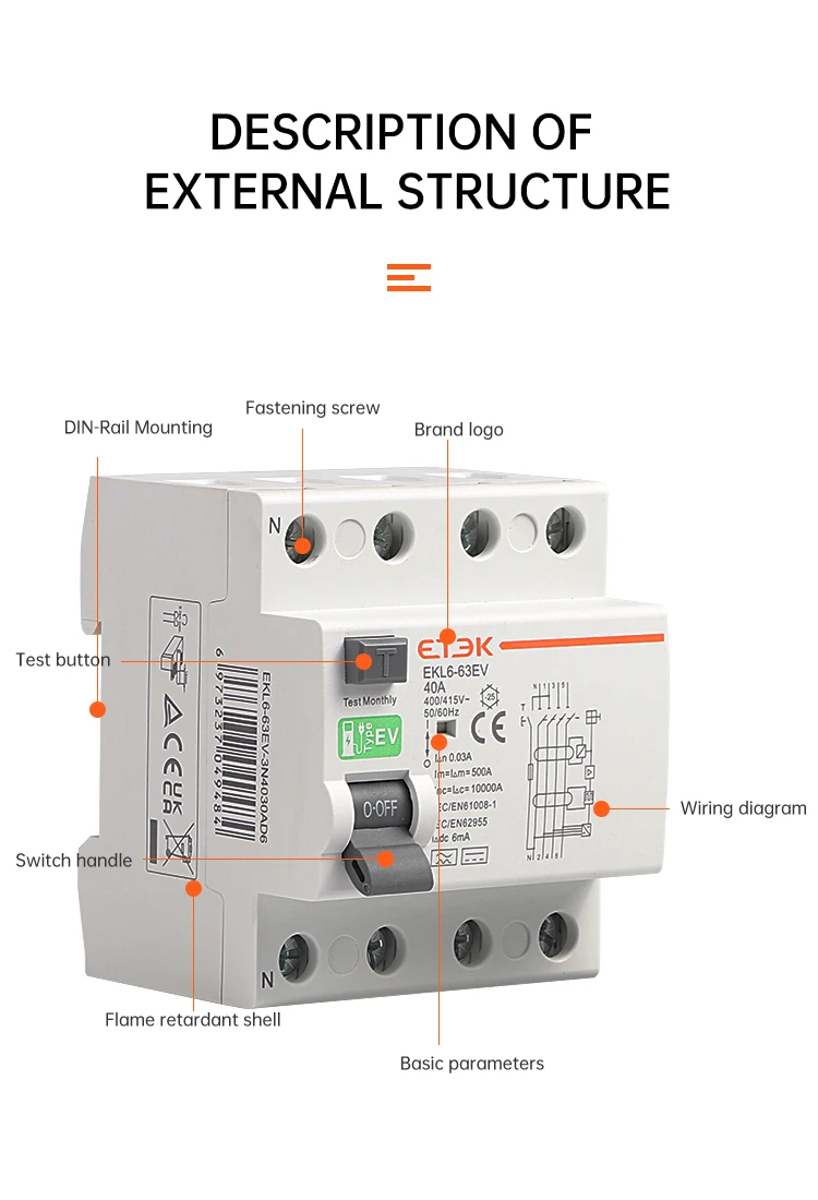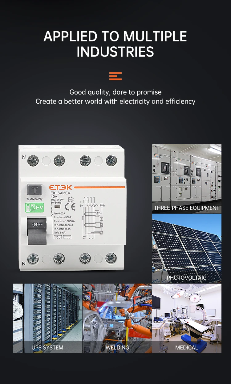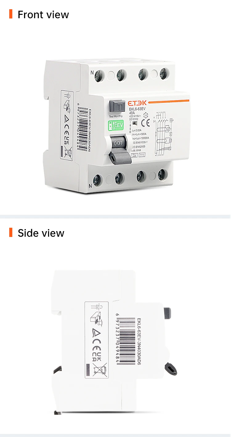 Тип EV RCCB, в дополнение к нормальному типу A, также может обнаруживать утечку постоянного тока 6 мА, что делает его безопасным для использования в приложениях, где может быть отправлена утечка постоянного тока, таких как зарядные столбы для электромобилей.