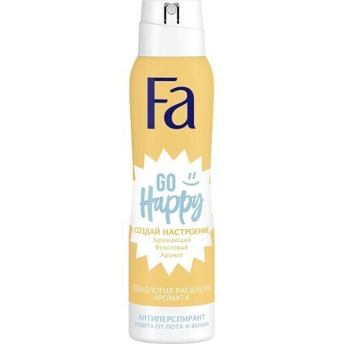 Описание: Антиперспирант спрей женский Fa (Фа) Go Happy «Создай Настроение», 150 мл. Fa Go Happy – женский антиперспирант, чья основная задача – защита от пота и запаха. Средство обеспечивает защиту до 48 часов. Антиперспирант дает ощущение длительной свежести и активирует аромат, когда это особенно необходимо. С технологией против пятен.