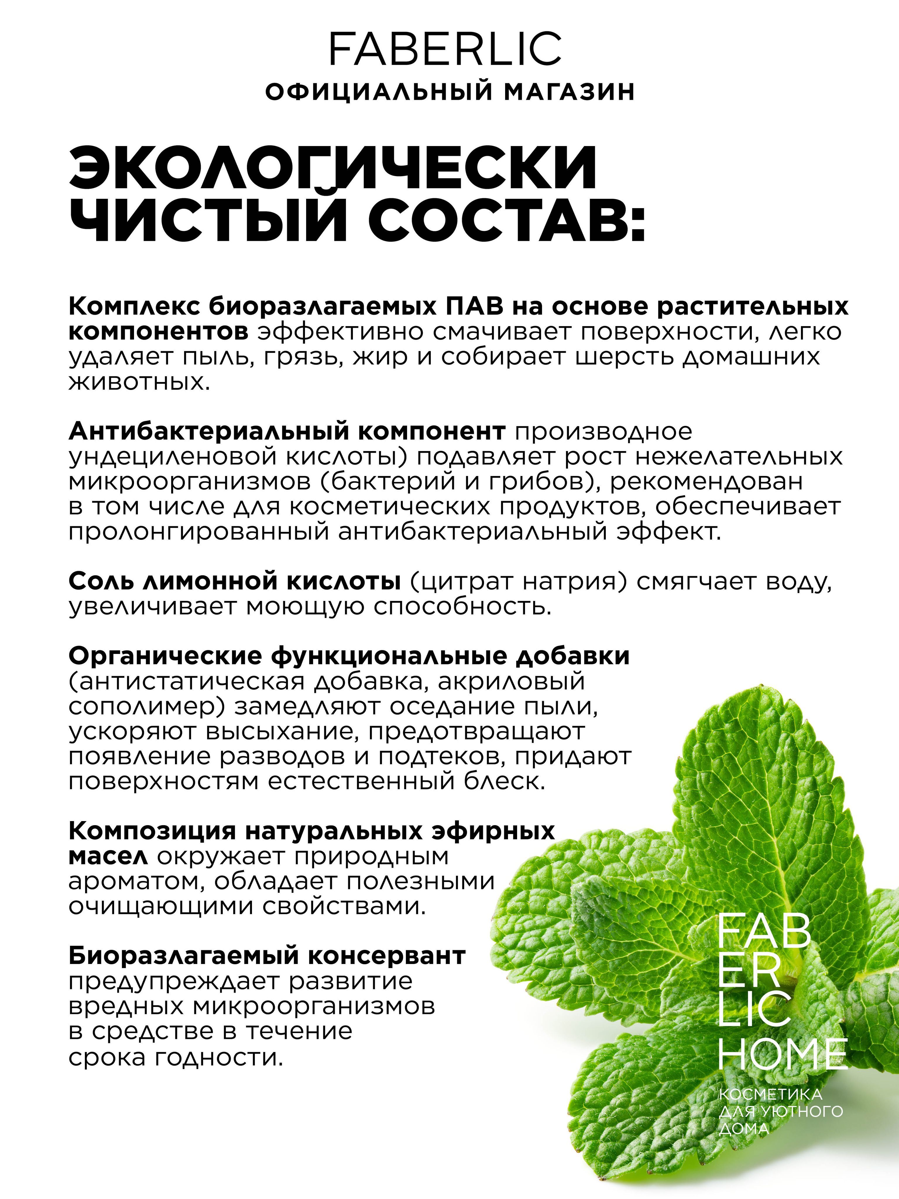 Faberlic Home ECO Ароматизированное мультифункциональное средство жироудалитель с ароматом “Цитрус и Мятное масло”, эффектом антистатик и антипыль – это экологически чистое концентрированное жидкое дезинфицирующее средство для борьбы против бактерий, пыли, шерсти и неприятного запаха.
