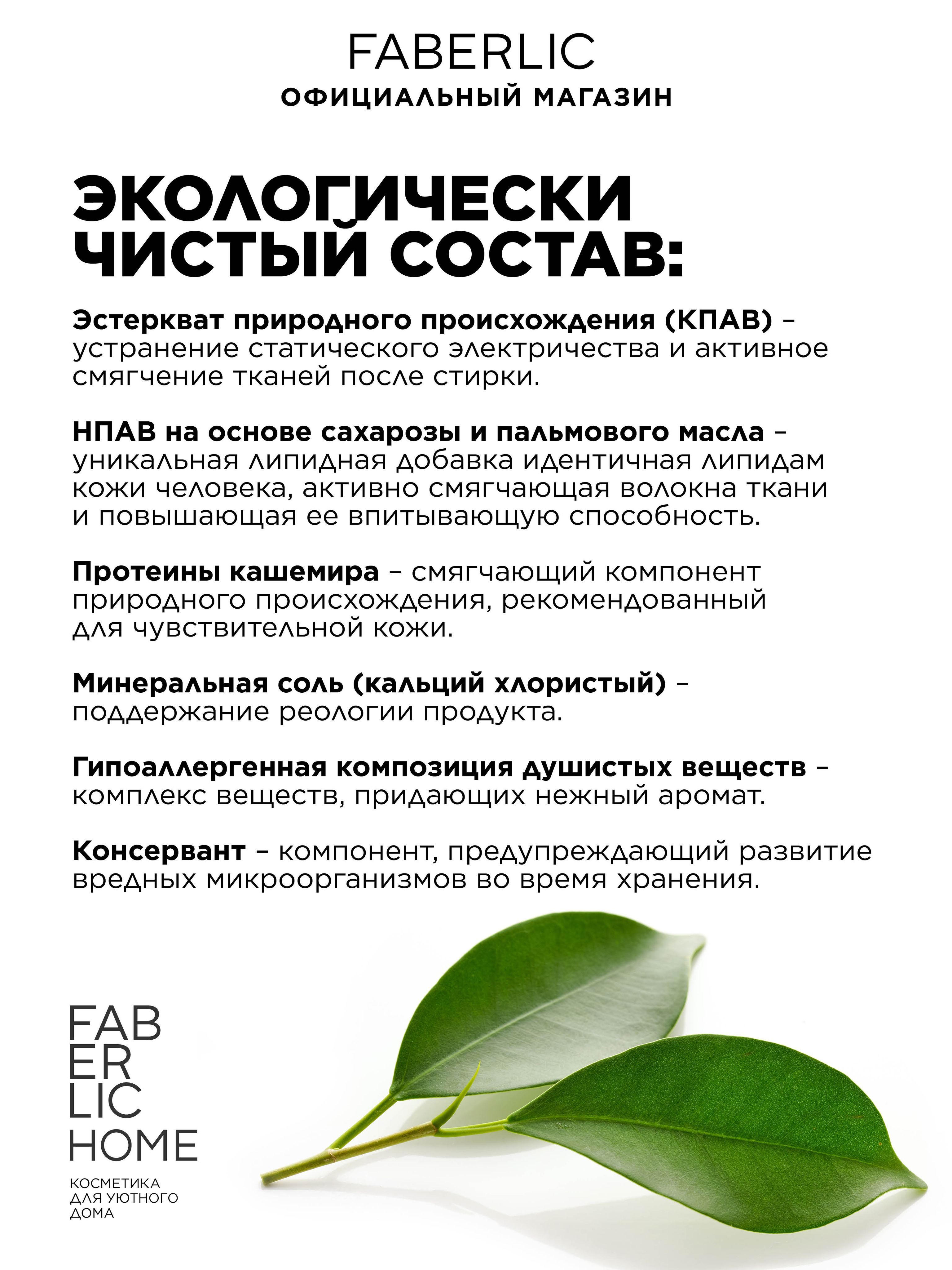 Мягкая ухаживающая формула кондиционера-бальзама и комплексное действие особой липидной добавки и протеинов кашемира придают белью и одежде необычайную мягкость и шелковистость. Натуральные компоненты обволакивают и восстанавливают поверхность волокон тканей, устраняют ворсистость, исключая раздражение нежной кожи.