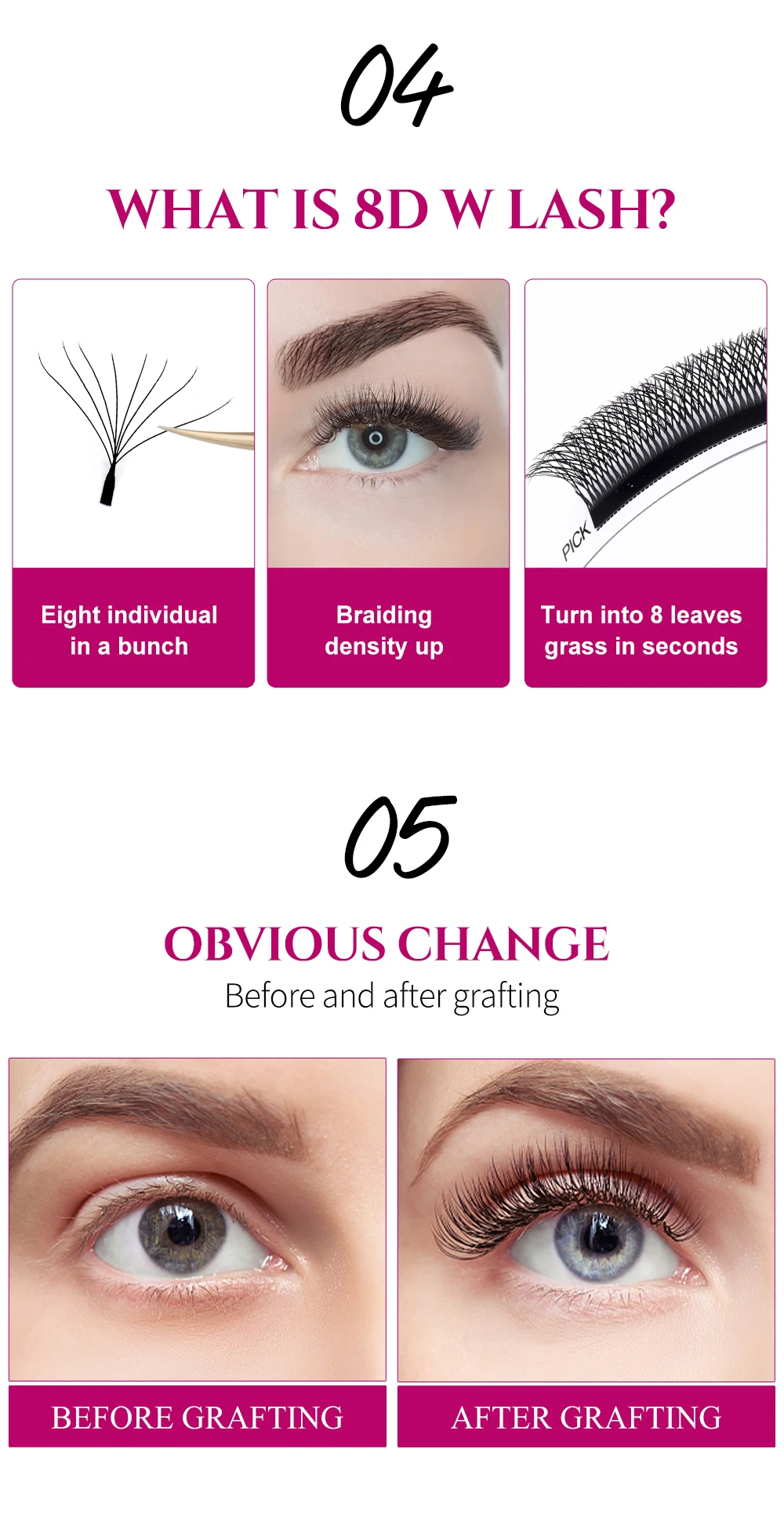 Вязанный 5D ресницами, форма напоминает ПЯТЬ листьев клевера, который автоматически расцветает при снятии волос. Он быстро заполняет зазоры и больше подходит для работы, чем традиционные Автомобильные ресницы вентилятора. Скорость прививки и плотность ресниц увеличены более чем на 90%.
